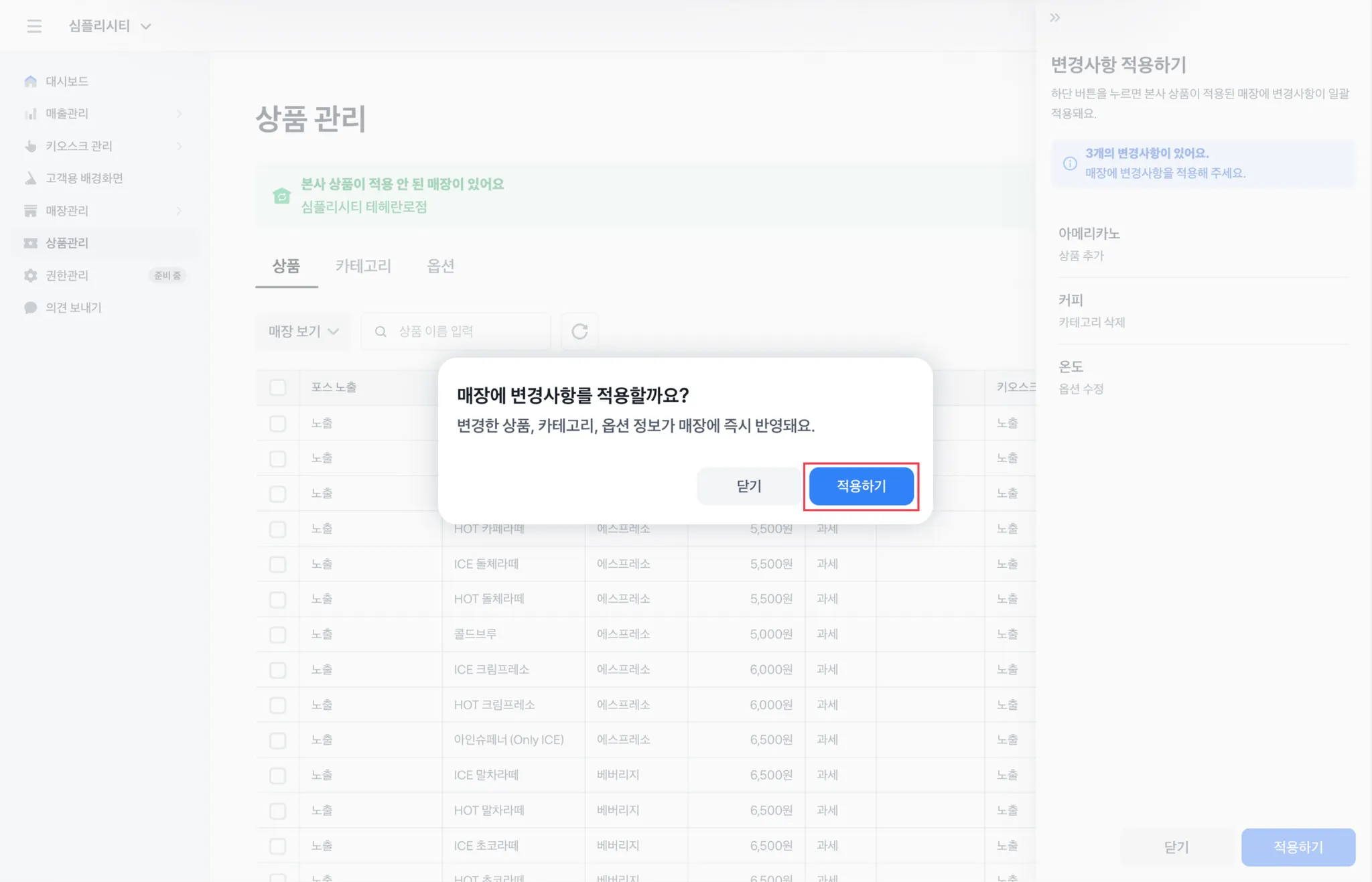 변경한 상품, 카테고리, 옵션 정보가 매장에 즉시 반영돼요.