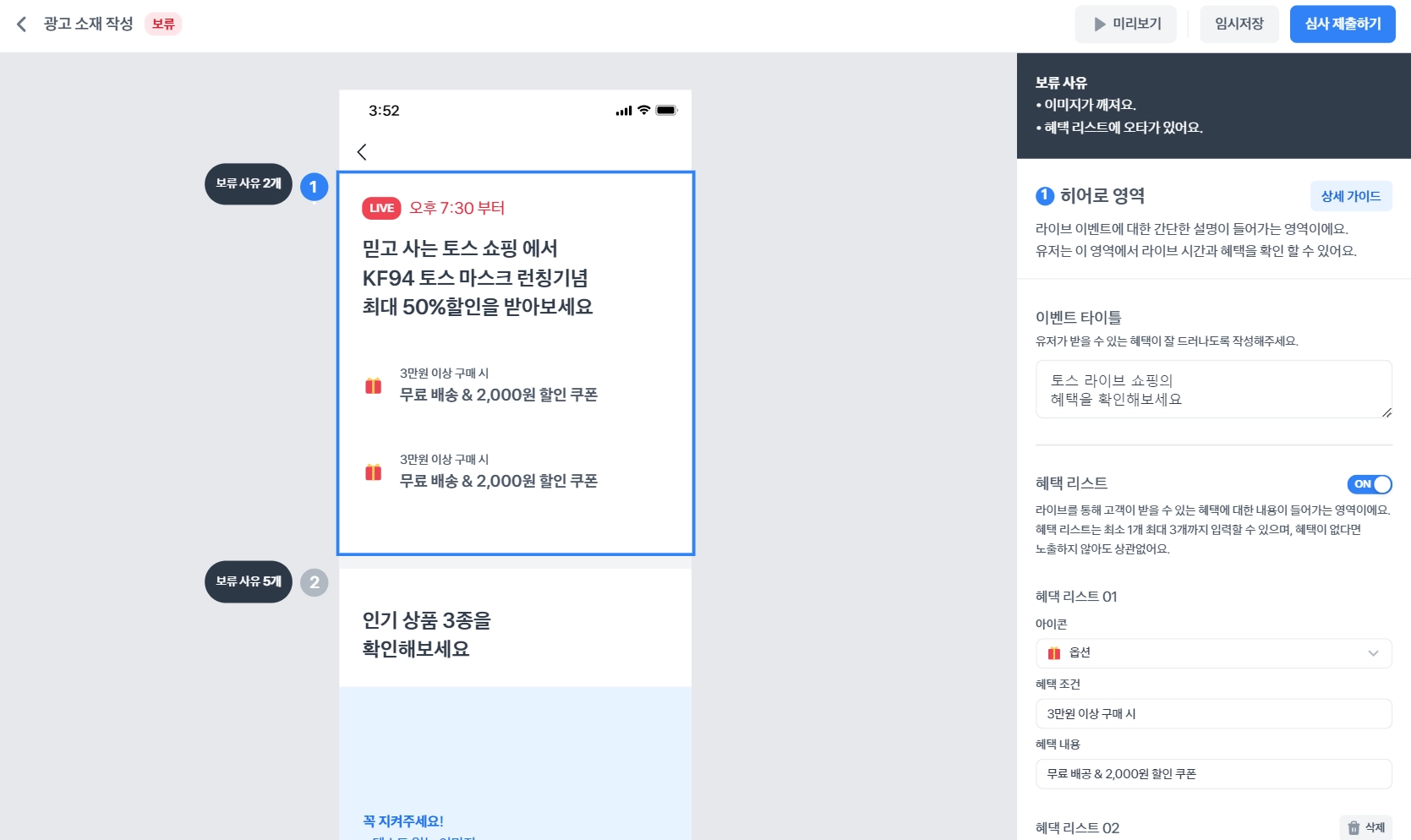 소재 심사는 평일 10:00 ~ 19:00이며, 모든 소재는 순차적으로 검수됩니다.