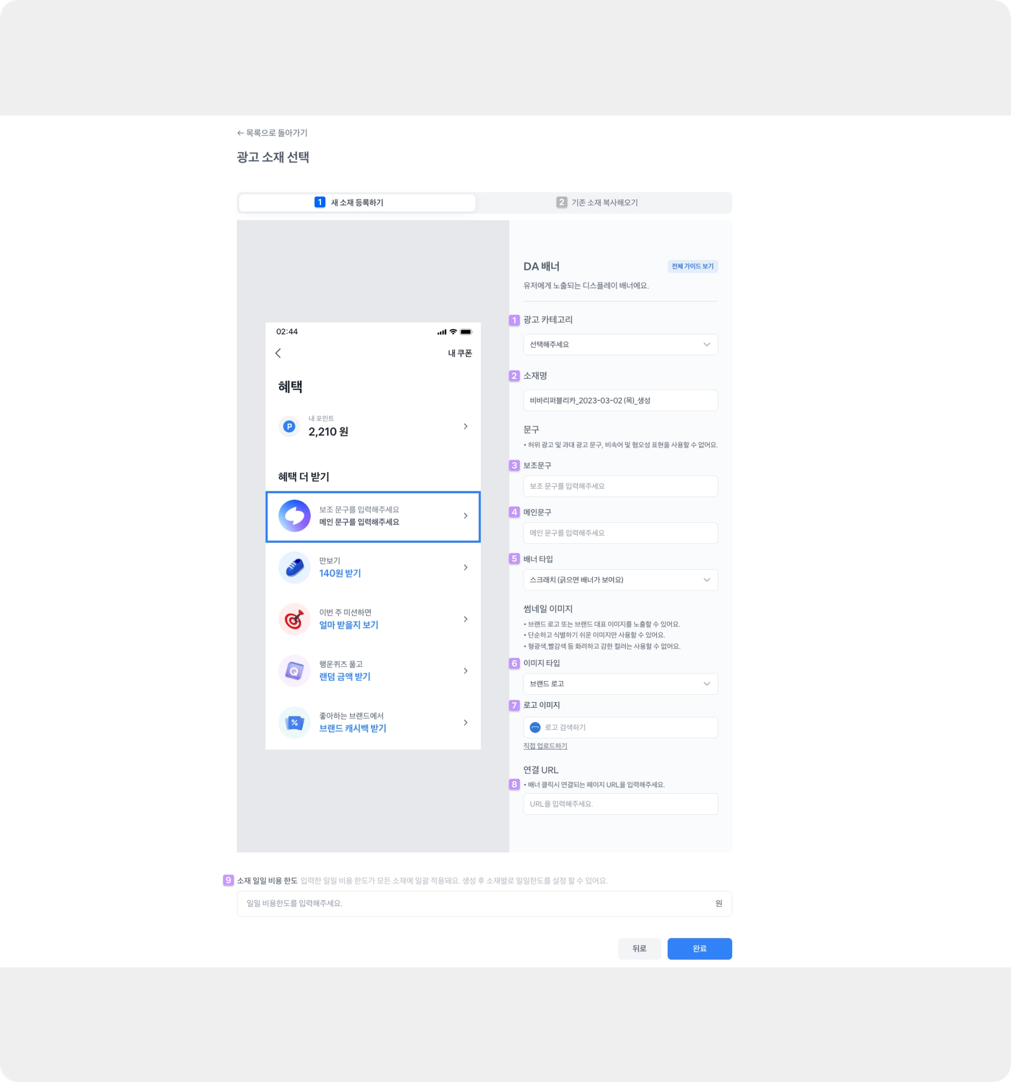 소재는 광고 지면을 구성하는 이미지, 텍스트, 랜딩 URL 등 컨텐츠를 의미합니다.