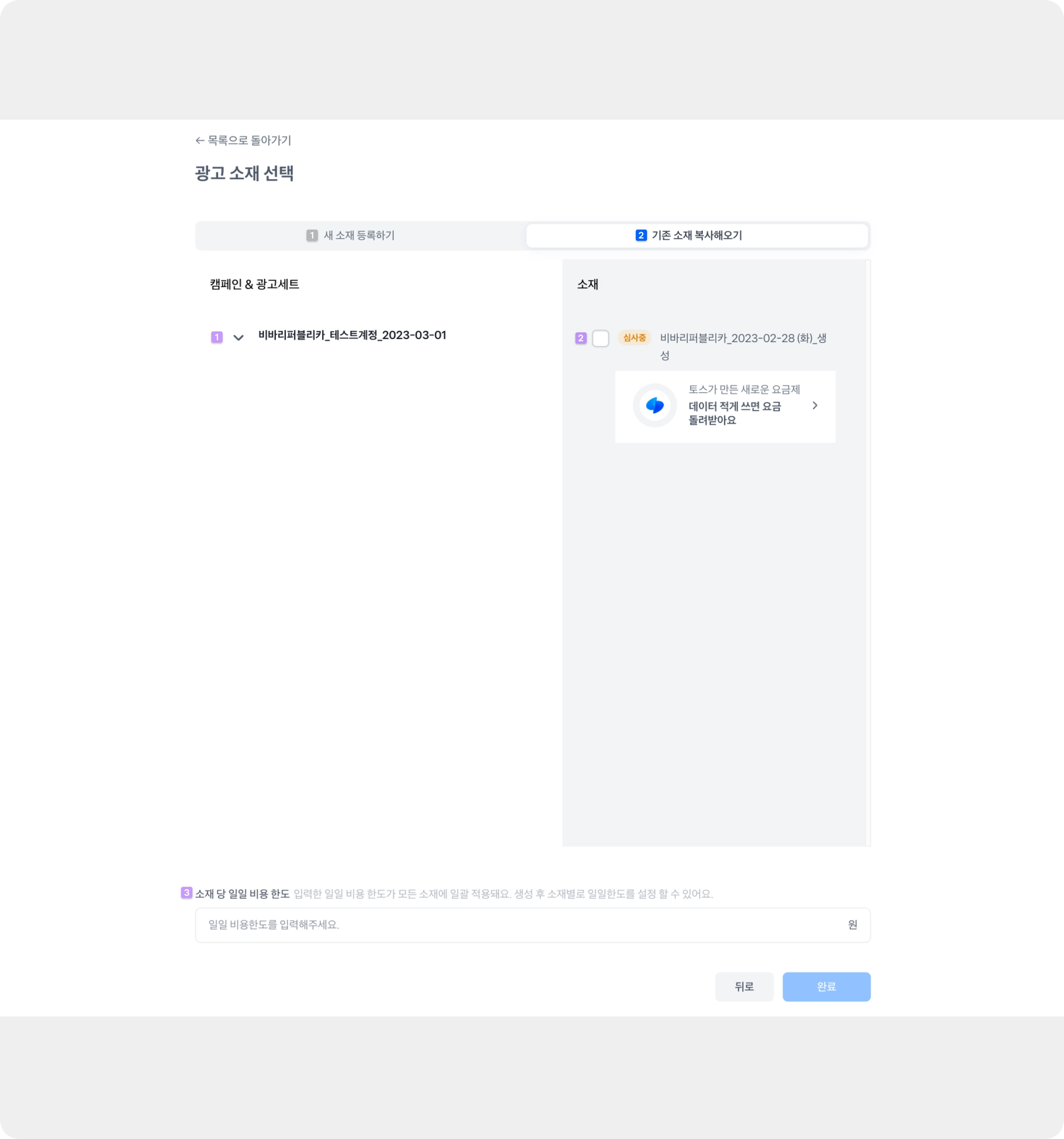 다수의 중복 소재를 등록하는 경우에는 심사 승인이 더 오래걸릴 수 있으며, 토스 내부 기준에 따라 광고 집행이 제한될 수 있습니다.