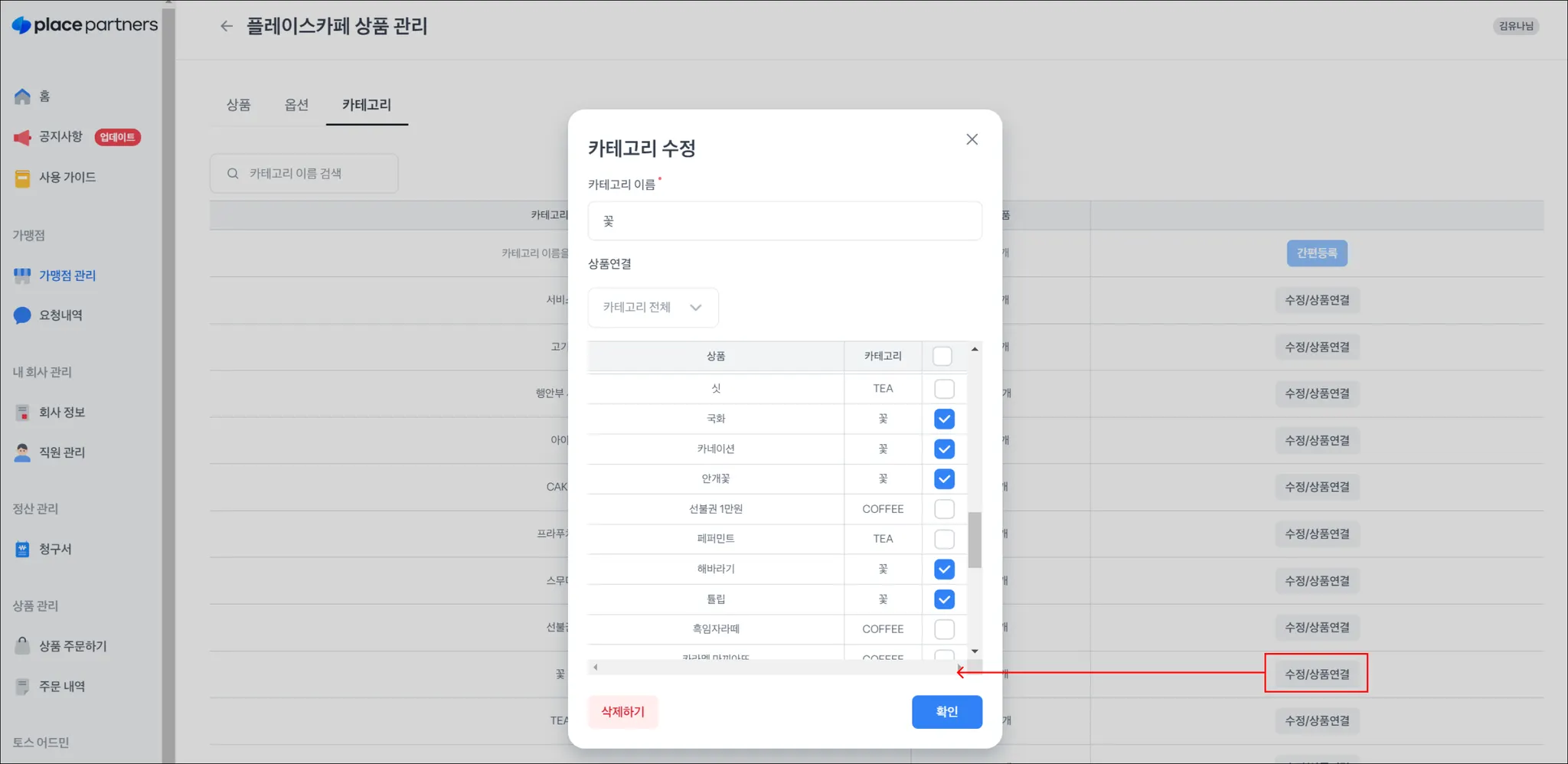 카테고리 수정/상품연결을 눌러 카테고리에 넣을 상품을 체크해주세요.