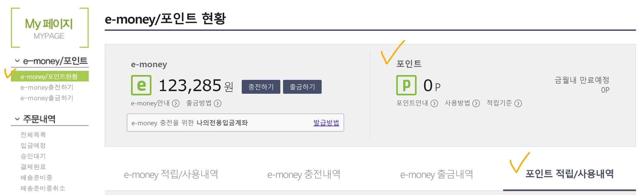 도매매 웹사이트 마이페이지 → e-money/포인트 → e-money/포인트현황에서 적립된 포인트의 총 금액과 적립/사용내역을 확인할 수 있어요.