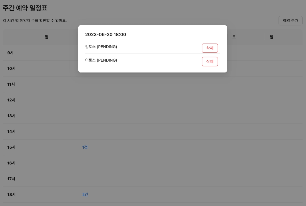 일정표에서 예약 건이 있는 시간을 선택하면 나타나는 일정 상세 정보 모달에 “삭제” 버튼을 추가합니다.