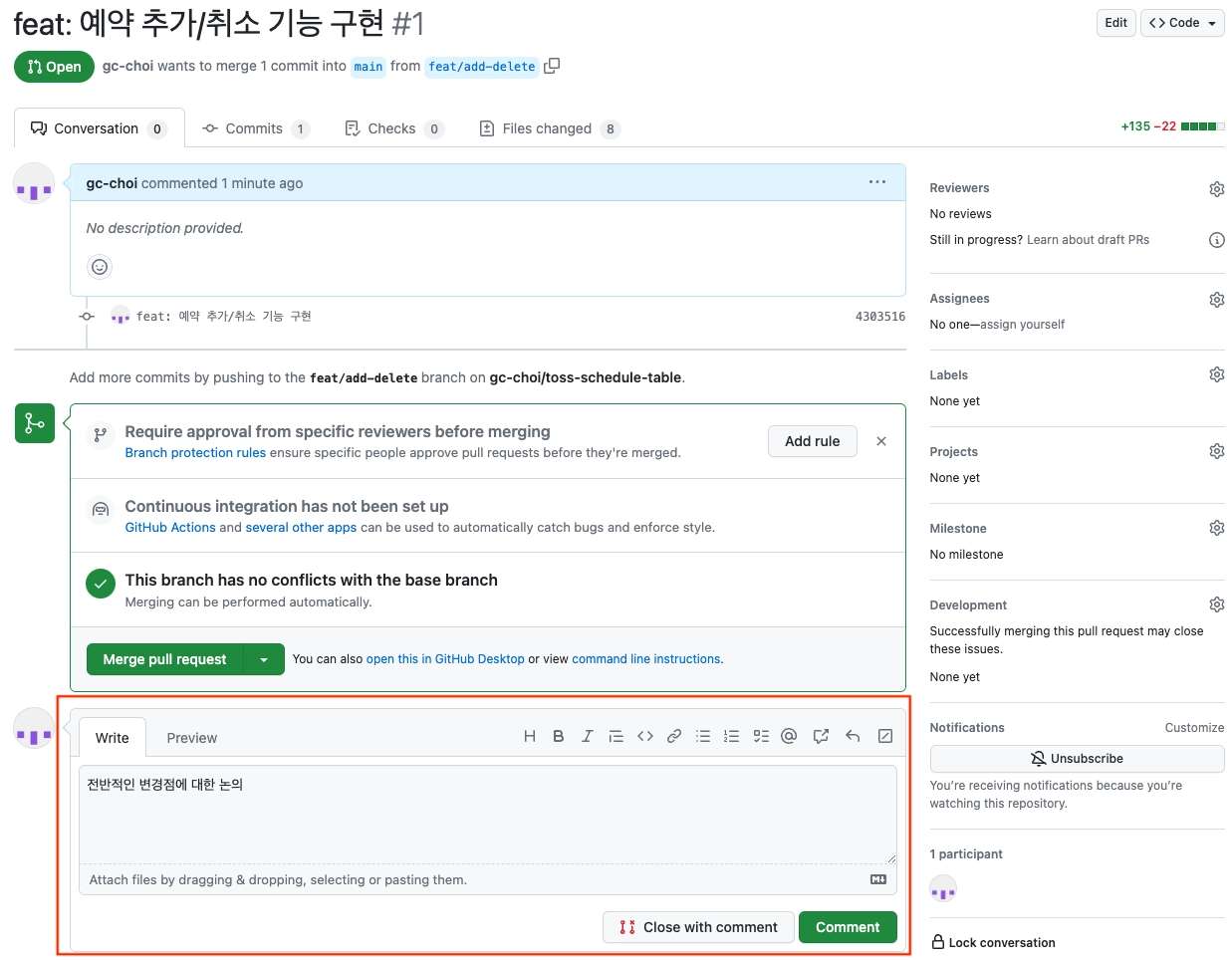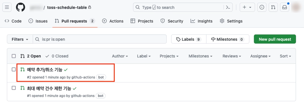 과제 안내 단계에서 자동으로 생성된 PR 중, “예약 추가/취소 기능” PR을 확인해주세요.