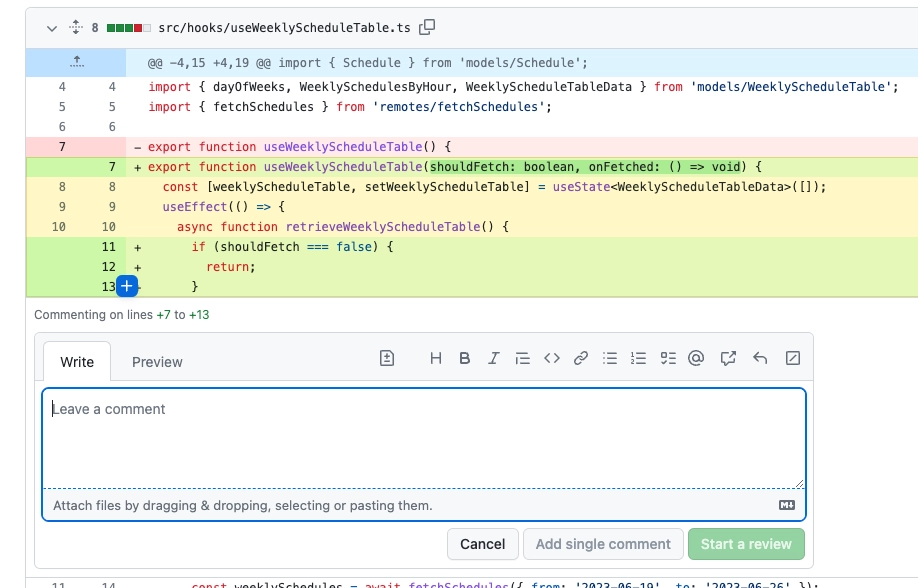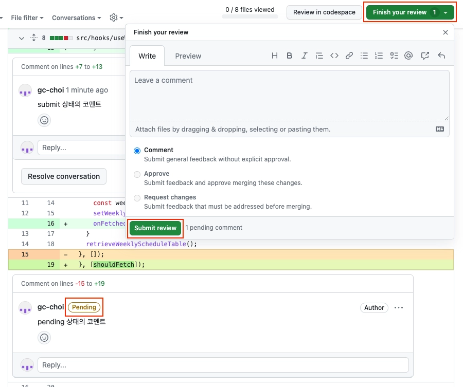 코드 개선이 필요하거나 논의가 필요한 변경점이 있다면 [Files changed] 탭에서 인라인 코멘트를 달아주세요. 인라인 코멘트를 남길 라인 번호에 마우스를 올리면 [+] 버튼이 뜨고, 드래그 하거나 클릭하면 입력창이 뜹니다.