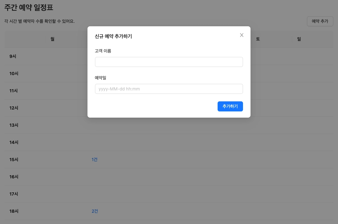 작업이 완료되면 “신규 예약 추가하기” 모달은 자동으로 닫힙니다.