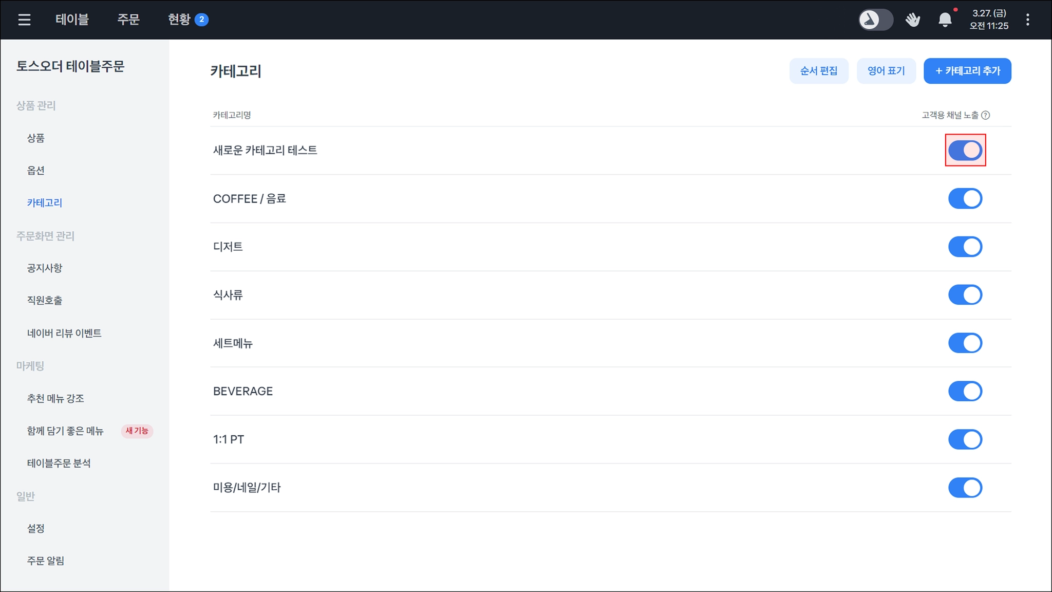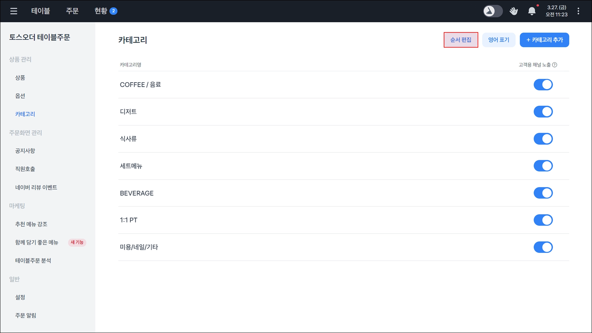 토스포스 카테고리 노출 순서 변경도 가능해요.