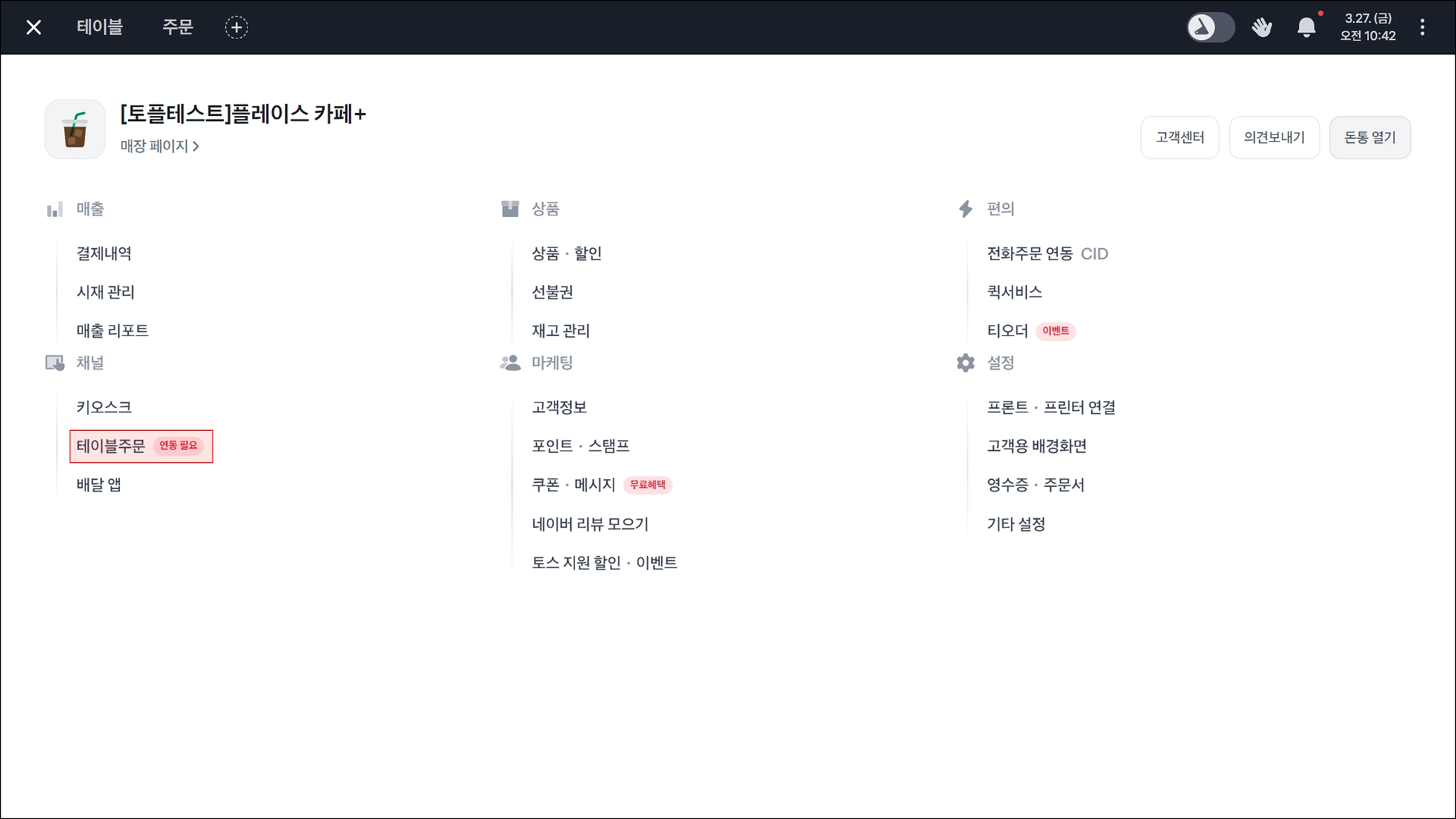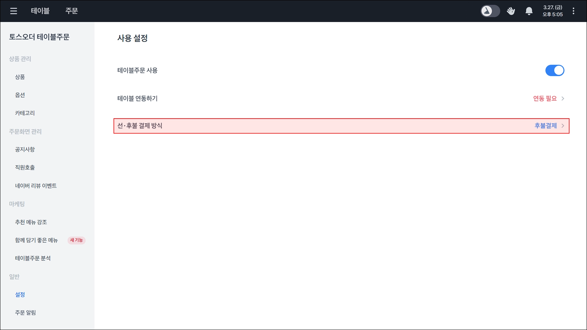 해당 설정은 테이블 주문 뿐만 아니라 토스 포스 상품에도 영향이 갈 수 있으니 꼭 주의해 주세요!