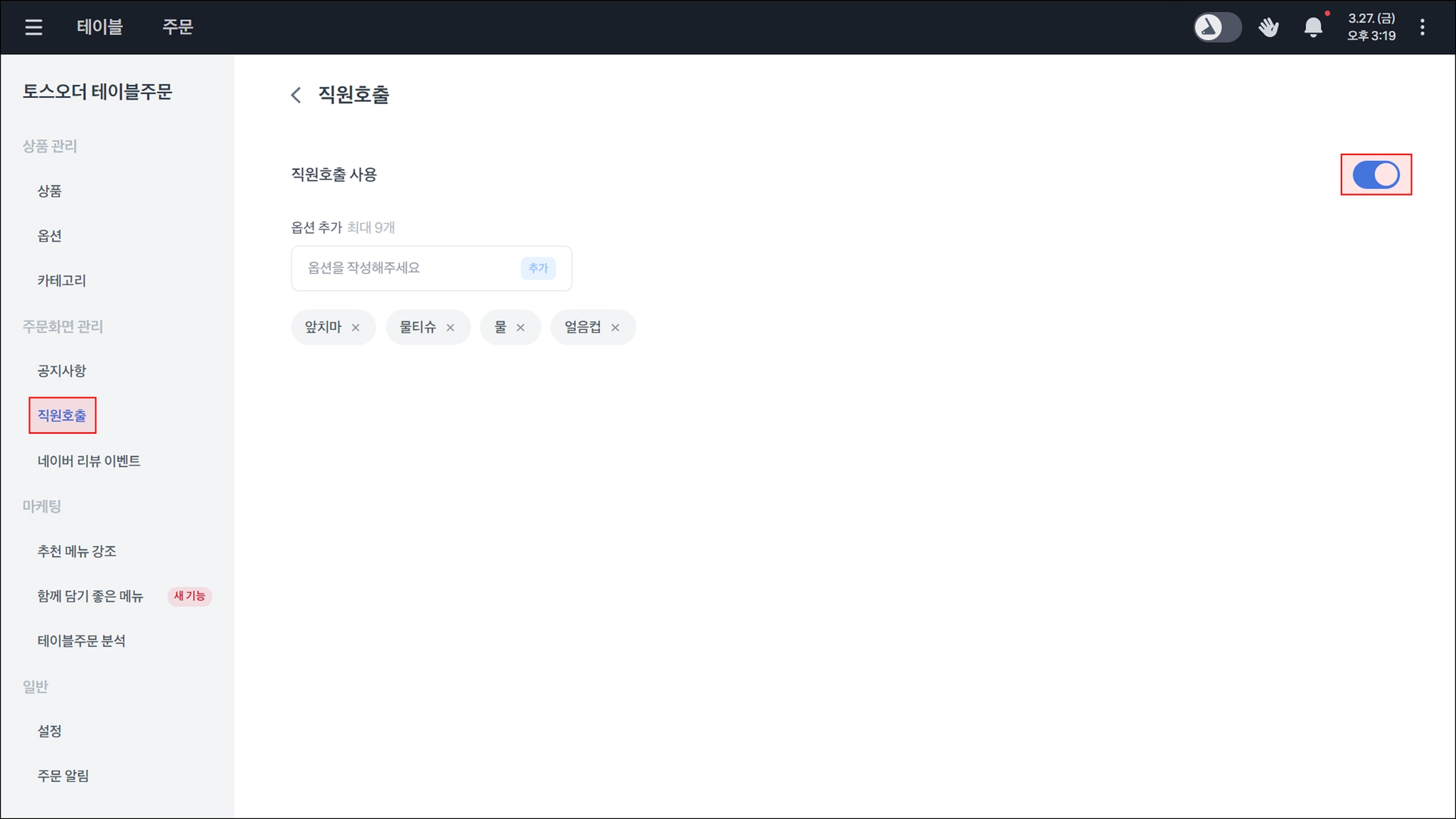 토스포스 왼쪽 상단 ≡ → 테이블주문 → 직원호출 → 직원호출 사용 버튼 ON 설정을 해요.