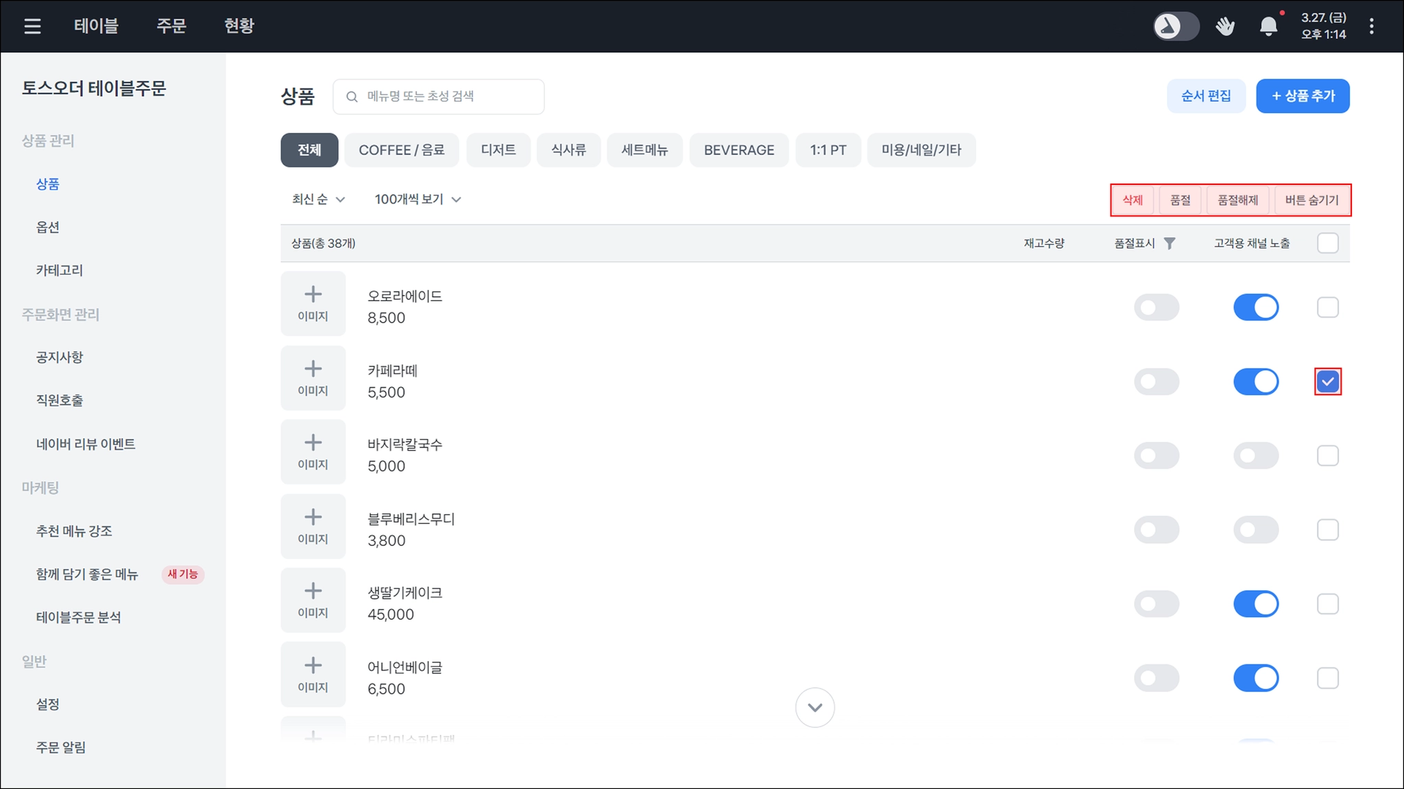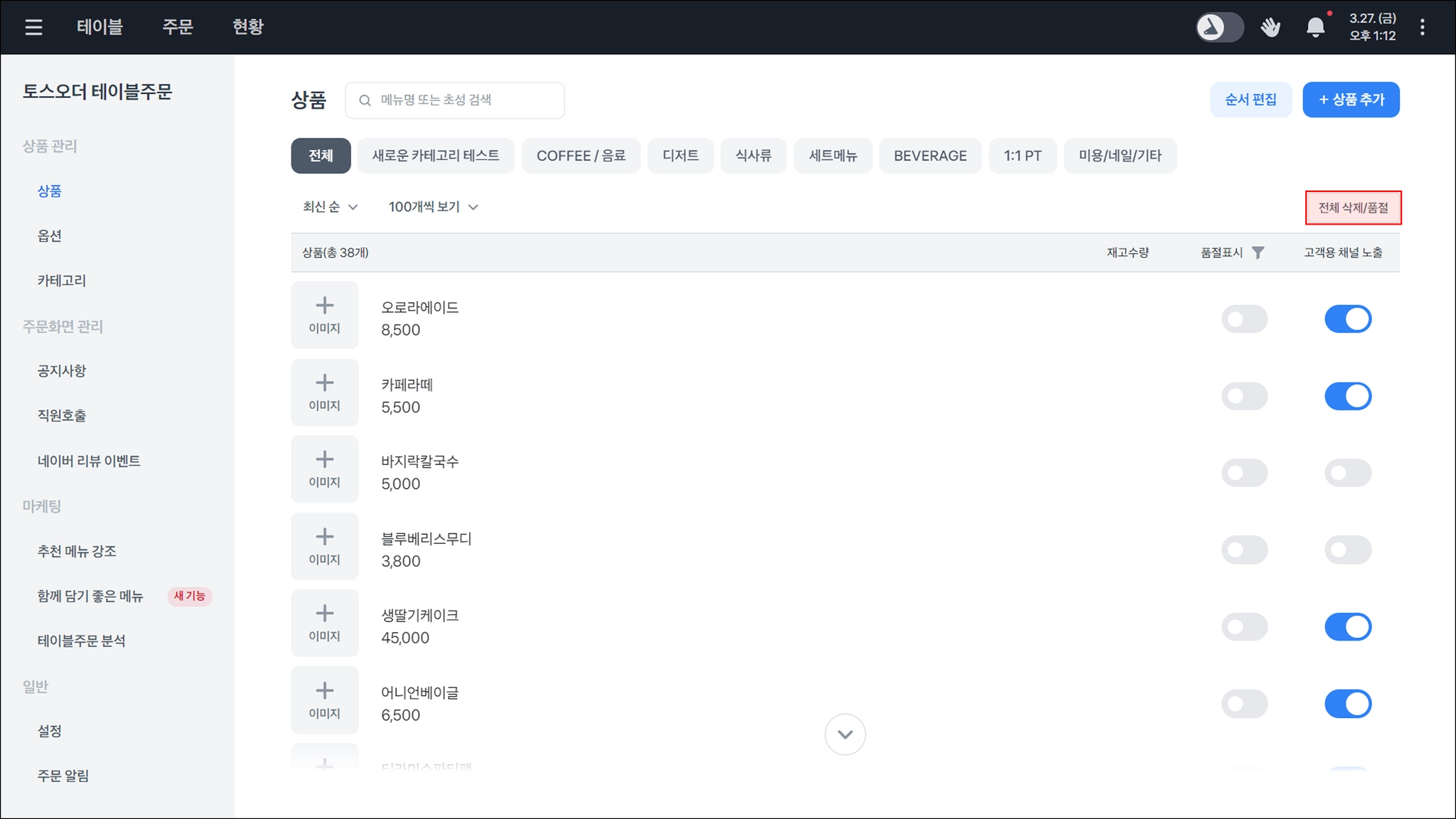 토스오더 테이블 주문에서도 상품을 삭제 또는 품절/품절해제 등록을 할 수 있어요.