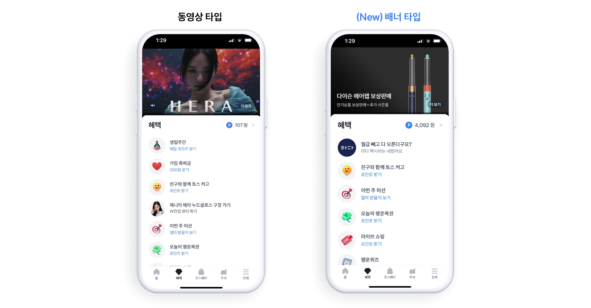 5,000만 Daily PV를 갖춘 토스 혜택탭 최상단에 크고 효과적으로 광고 소재를 노출할 수 있는 지면입니다. 진입 시 동영상/이미지 소재가 자동 노출되기에 브랜딩 캠페인을 고려하고 계신다면, 구매력 있는 토스 유저들에게 임팩트 있는 노출을 할 수 있는 지면입니다.