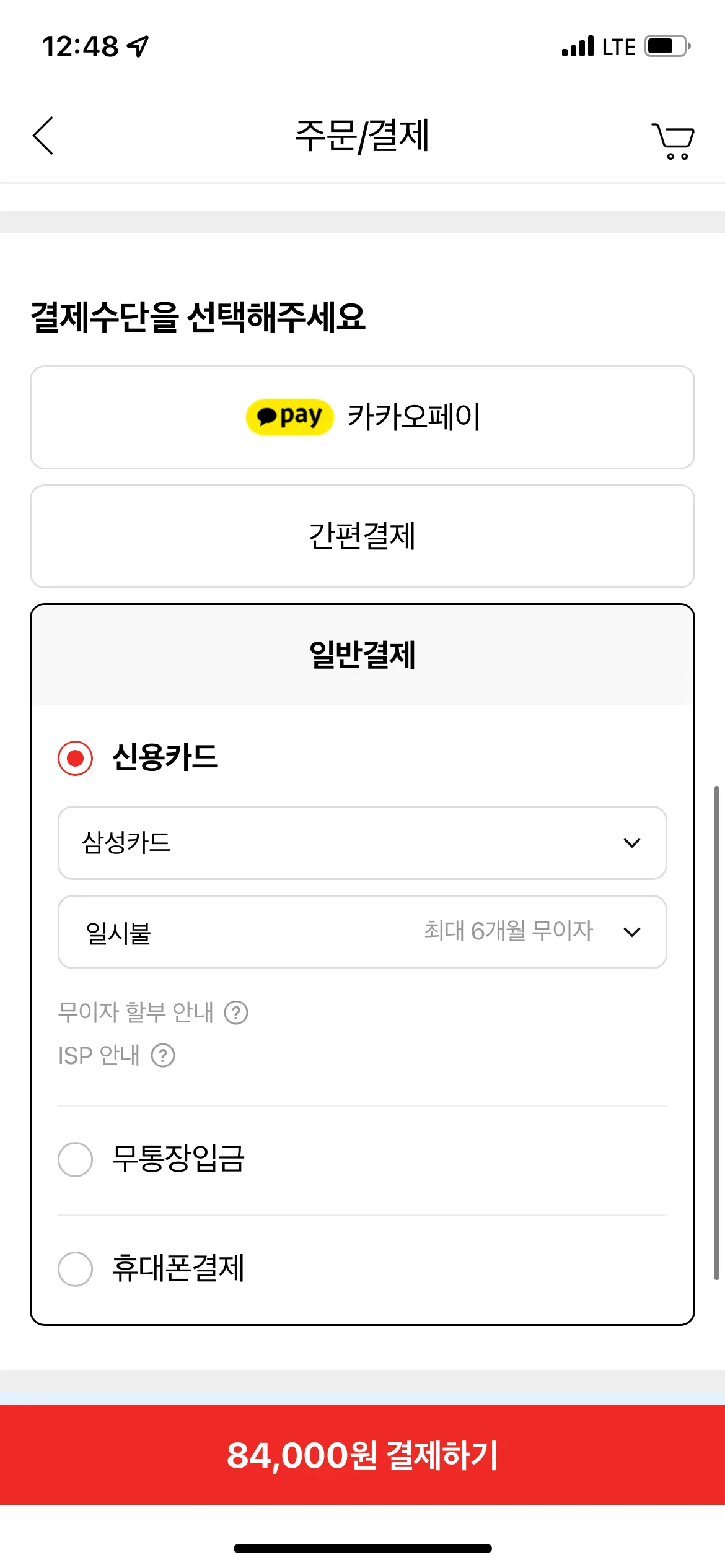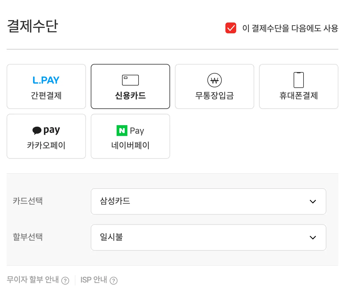 대부분의 인터넷 쇼핑몰에서 제공하는 신용/체크카드를 이용한 1회성 결제를 진행하는 경우