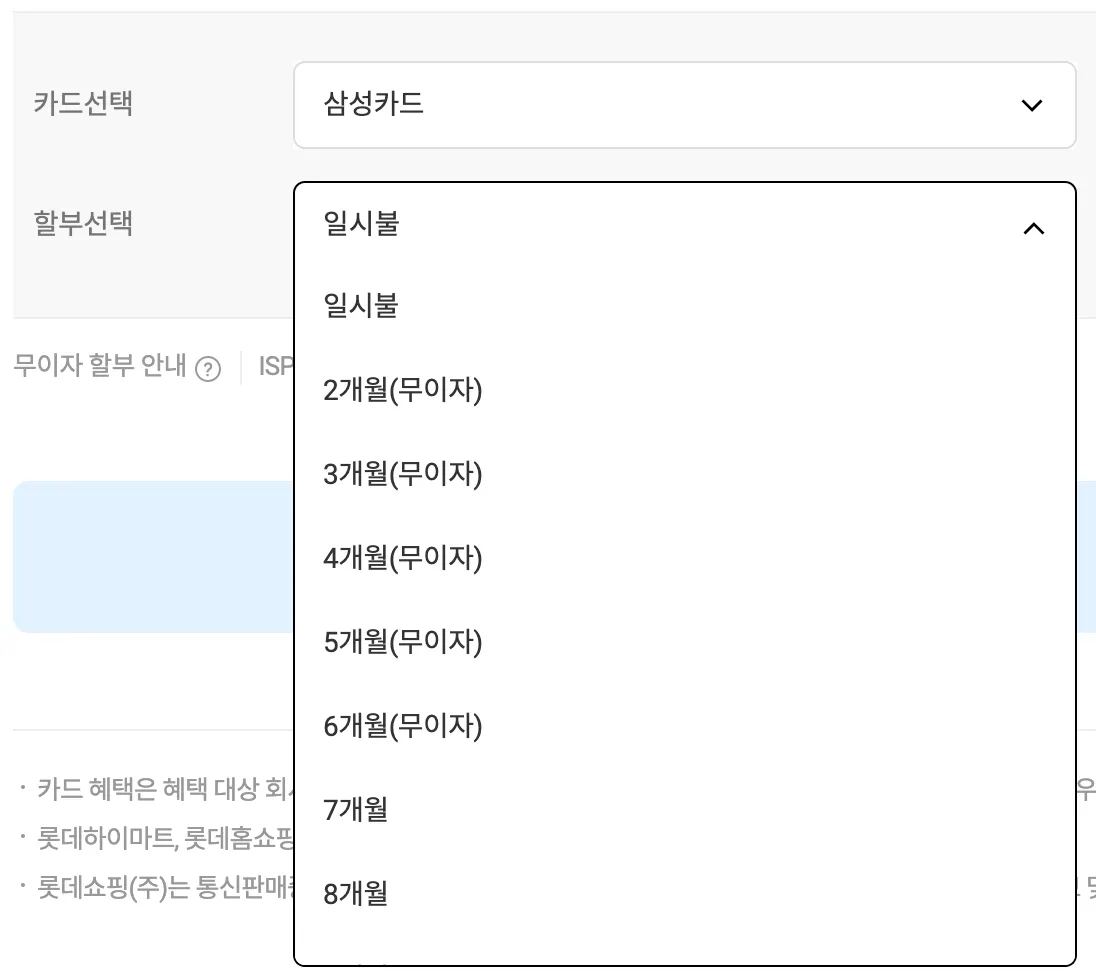 또한 카드사 별로 할부 결제가 가능한 최소 금액이 있기 때문에 현재 결제하시는 금액이 최고 할부 가능 금액을 넘는지 확인을 해주시고 넘는 경우에만 할부 개월 수를 선택할수 있도록 UI 를 구현하셔야 합니다.