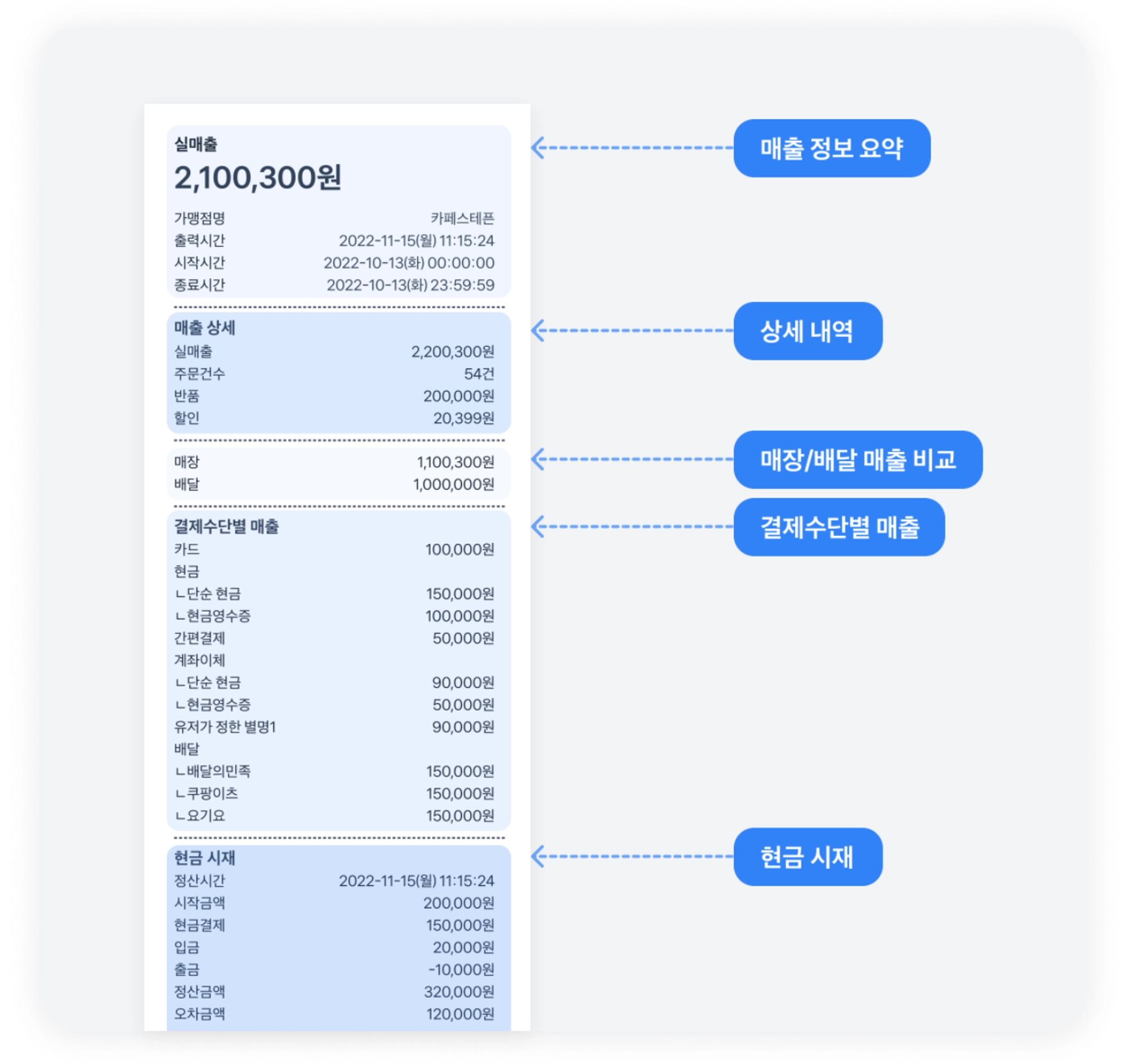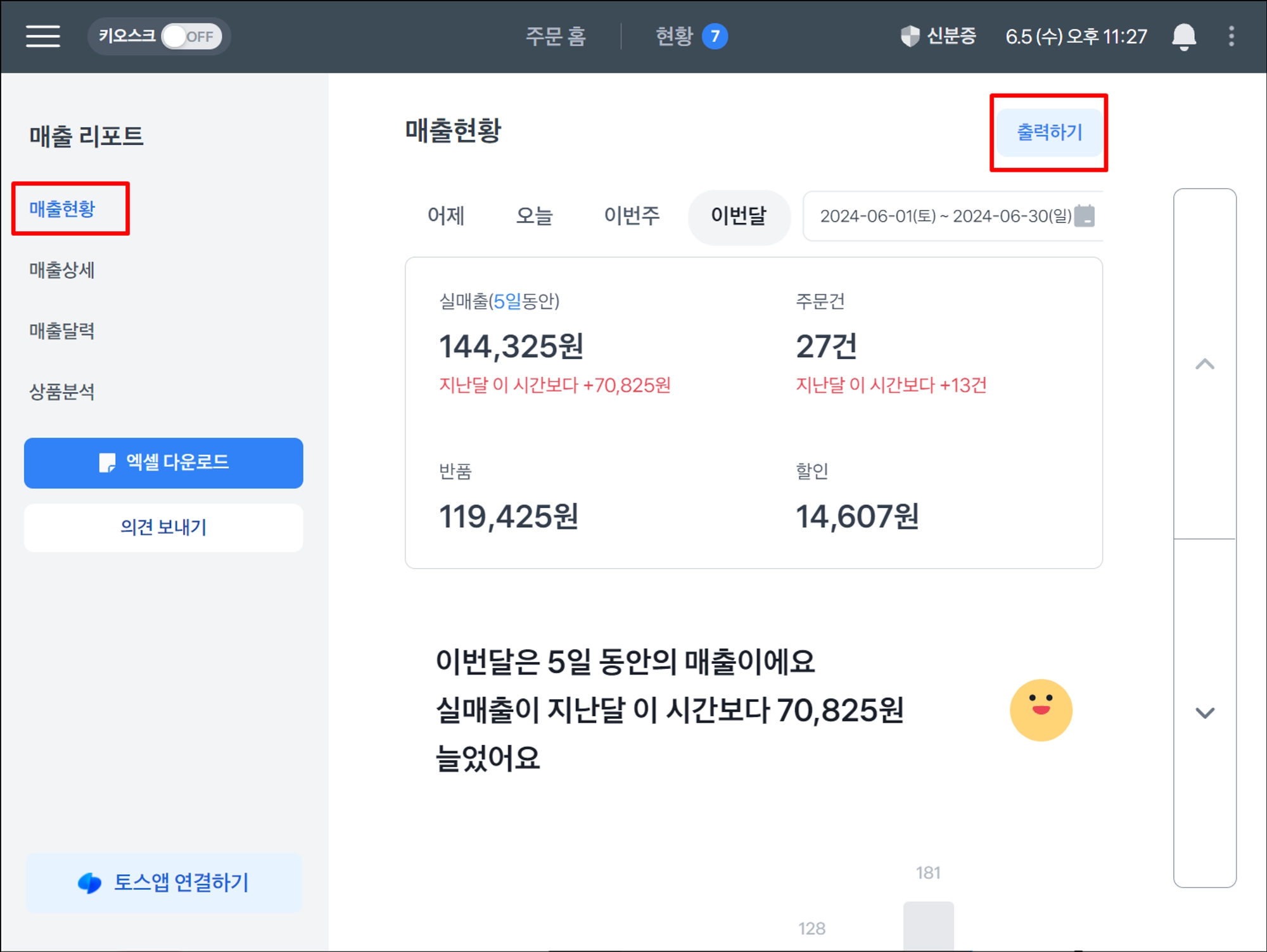 토스포스 매출리포트에 보여지는 매출현황을 연결된 영수증 프린터기로 출력 가능합니다.