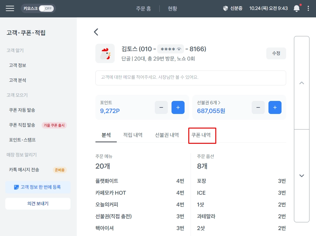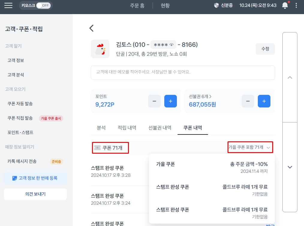 경로 : 토스포스 좌측 상단 ≡ → 고객·쿠폰·적립 → 고객 정보 → 해당 고객 선택 후 쿠폰 내역 클릭