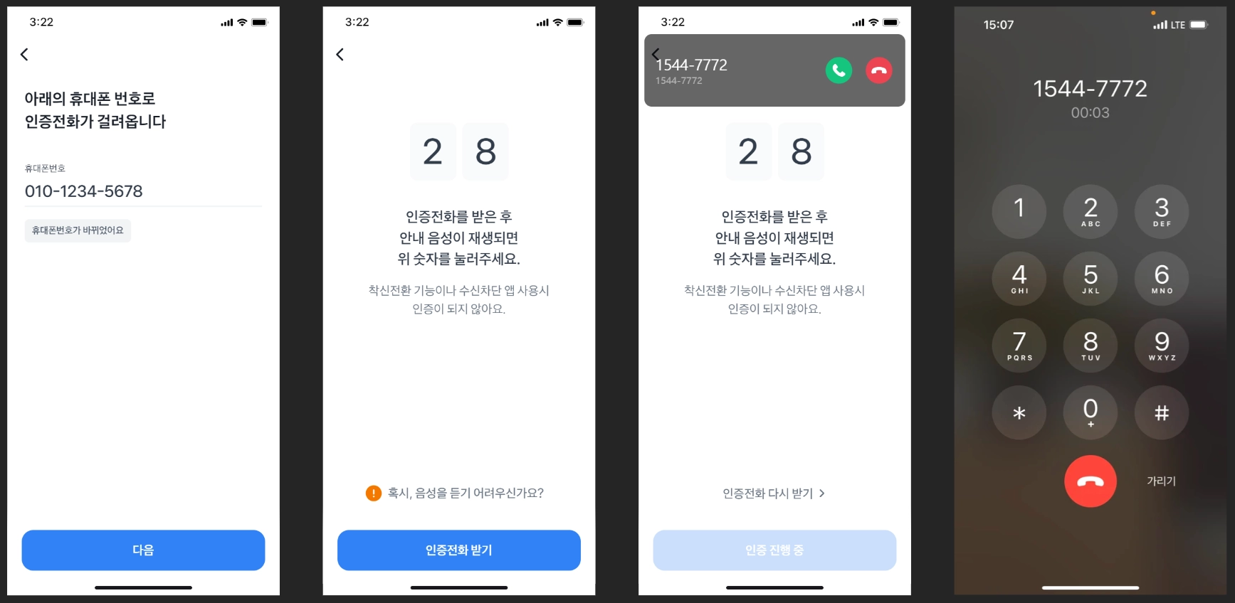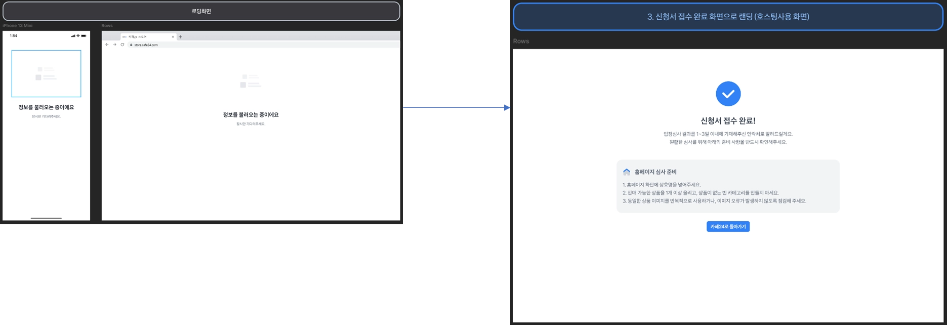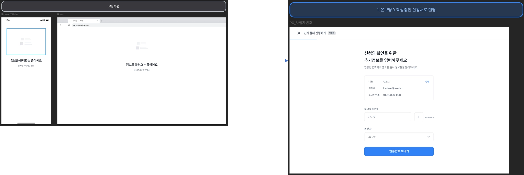 기본정보 (사업자등록번호, 신청인 정보, 홈페이지 주소 등)을 입력하여 신청서가 생성된 이후 이탈하고 다시 브랜드페이 앱 진입점을 진입하면 신청서 첫화면 (CI인증) 화면부터 진행합니다.