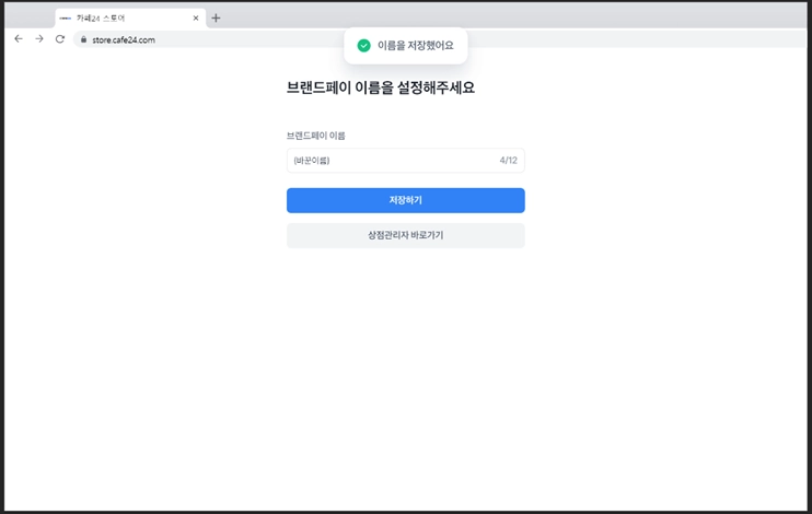 계약완료 이후 관리하기 버튼을 눌렀을 때 자동으로 브랜드페이 앱이 연동되며 아래 브랜드페이 명을 설정할 수 있는 페이지로 이동합니다.