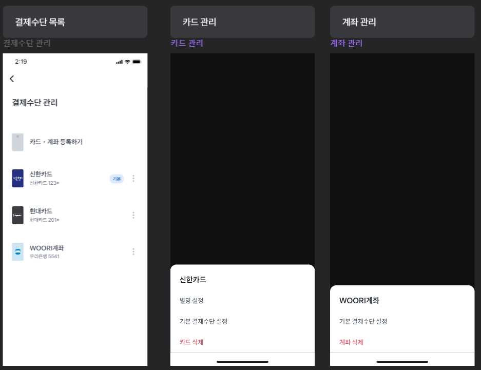 등록된 결제수단은 결제수단 관리 메뉴를 통해 가능하며 기본 결제수단 설정 및 결제수단 삭제가 가능합니다.