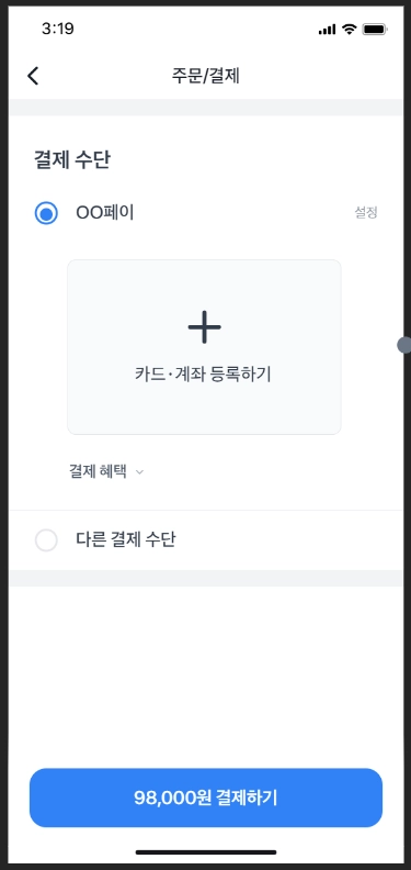 결제수단 등록 전 / 등록 후 화면입니다. 결제수단 1개 이상 등록 시에는 카드/계좌 등록하기 버튼은 마지막 등록 카드 또는 계좌 다음에 이어서 보여집니다.
