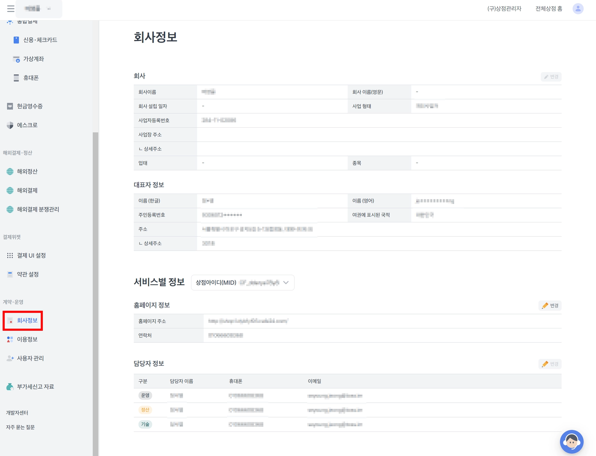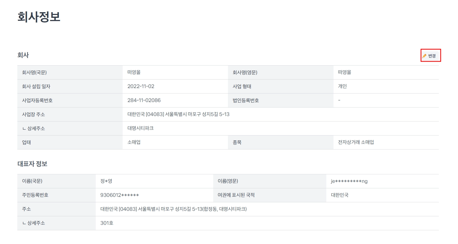회사 정보 상단에 변경 버튼을 클릭 해주세요.