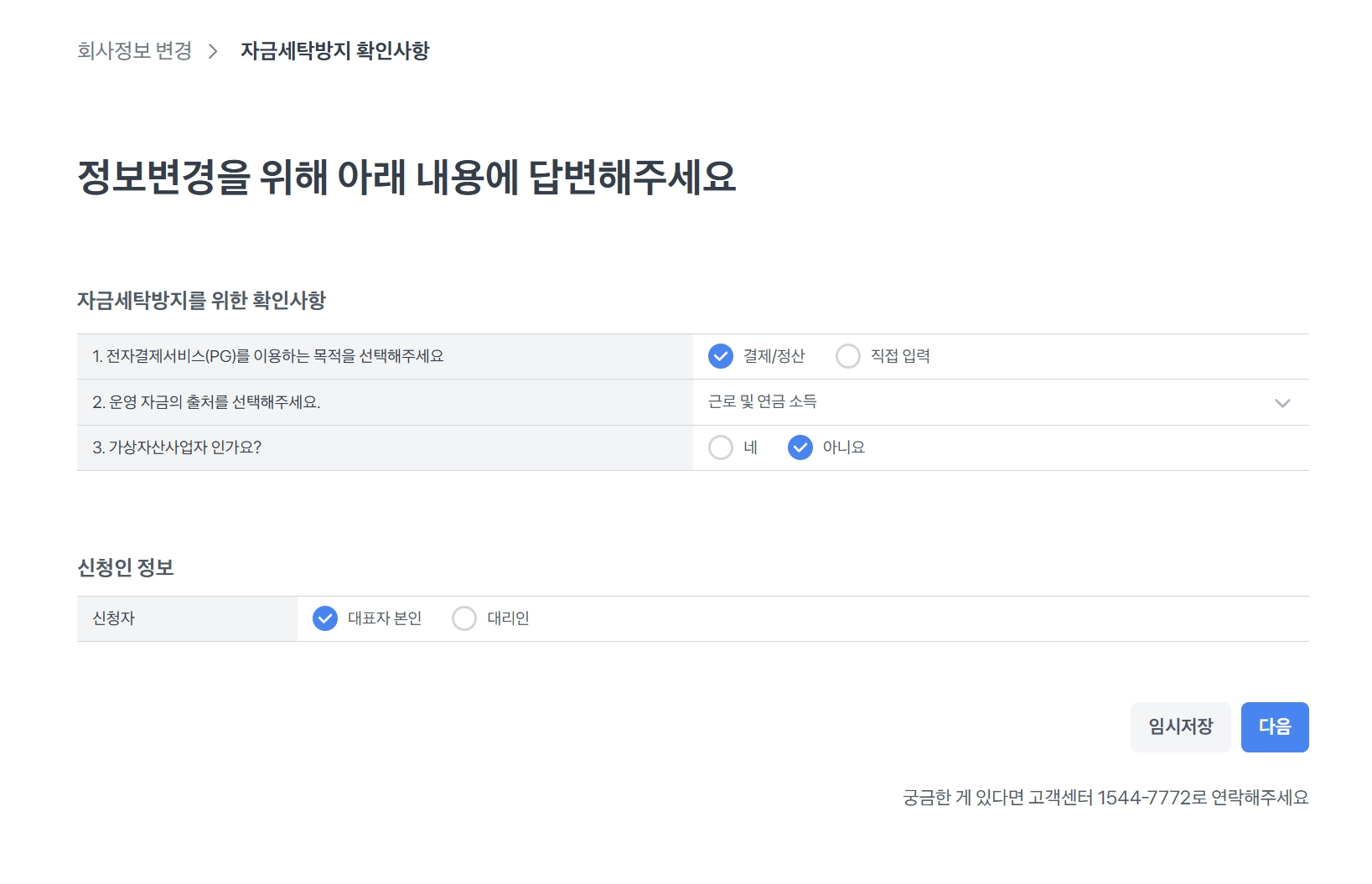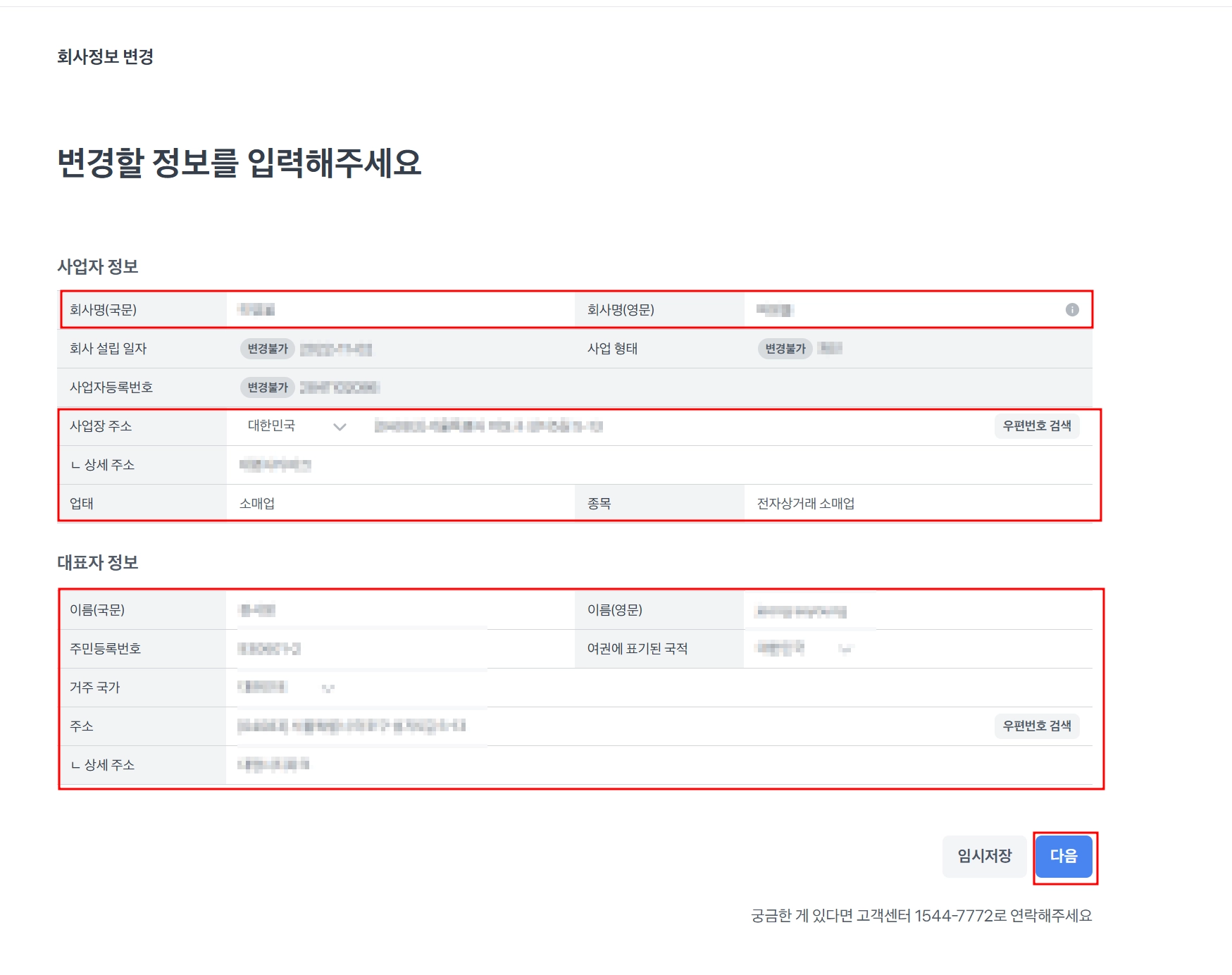 변경할 정보를 기재 후 다음 버튼을 클릭 해주세요.