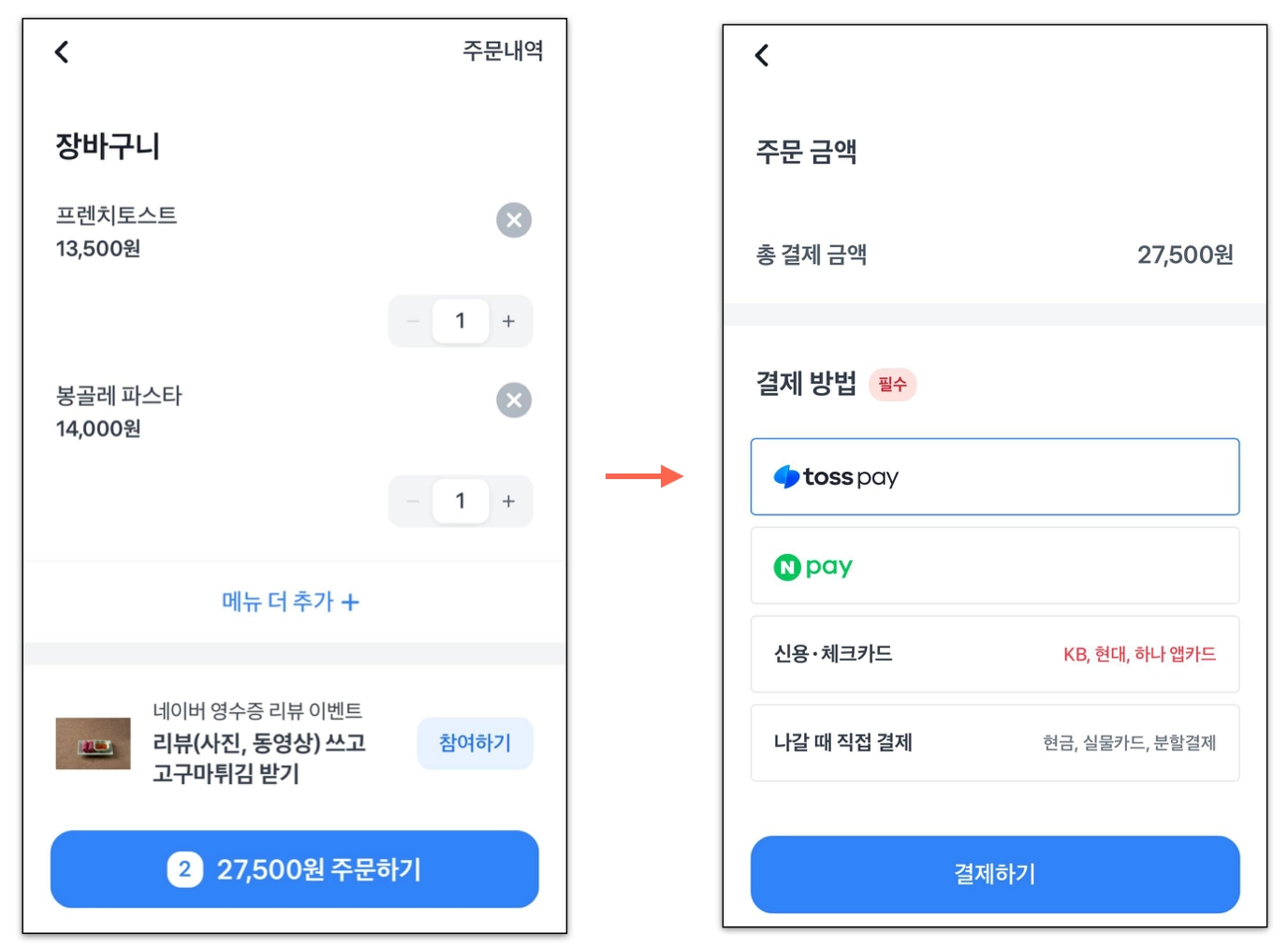 주문을 담은 후 고객 휴대폰에서 바로 결제할 수 있어요