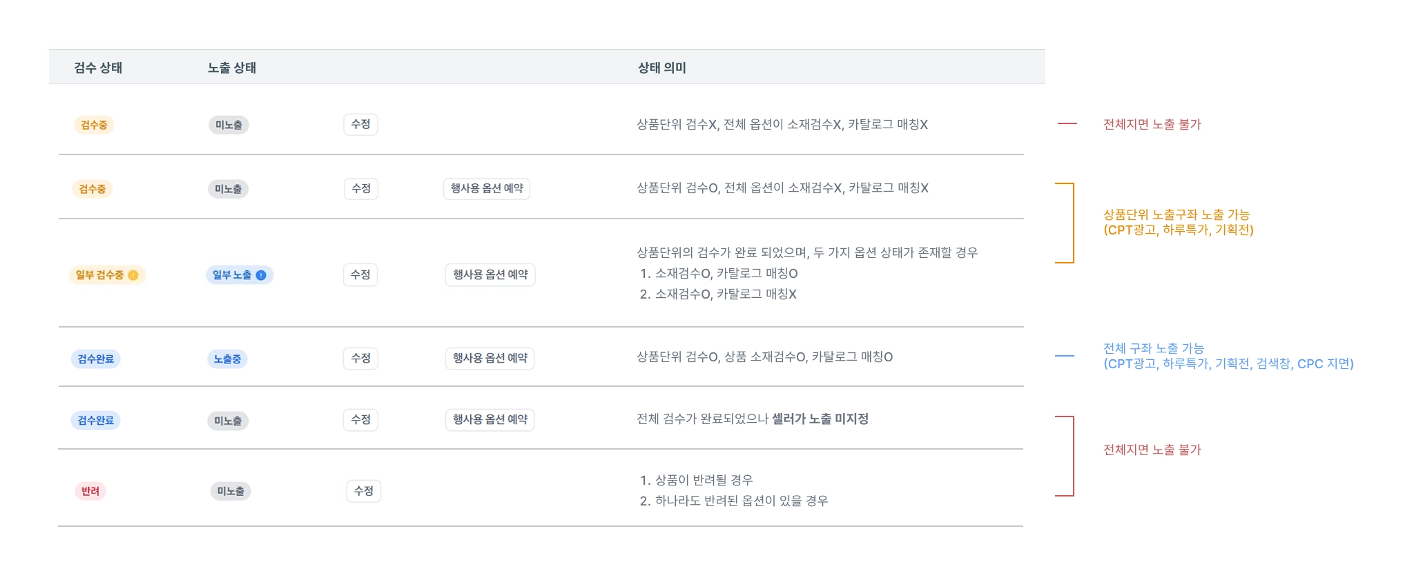 → 카탈로그 매칭이 완료된 상품이더라도 옵션을 수정하면 다시 검수중, 미노출로 표기될 수 있어요.