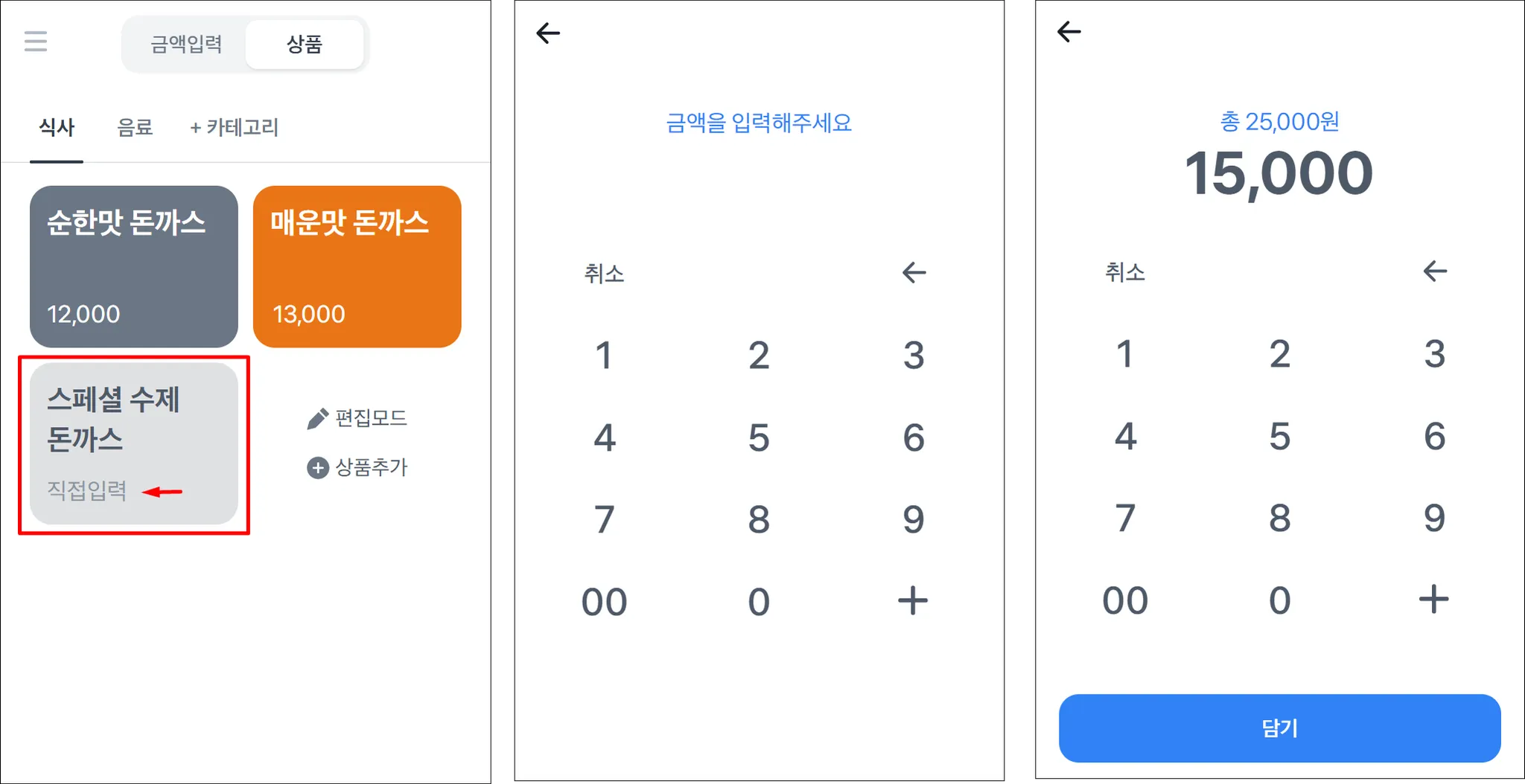 금액 입력과 상품을 복합적으로 사용해서 주문-결제도 가능해요.
