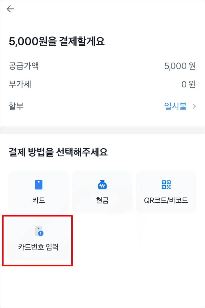 터미널에서 금액 입력 후 결제 시 결제 수단 선택에서 카드 번호 입력 수단 선택