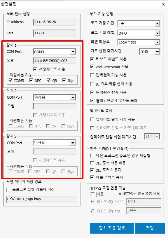 특수기능 → 5.부가장비설정 → 1.서명 및 리더기