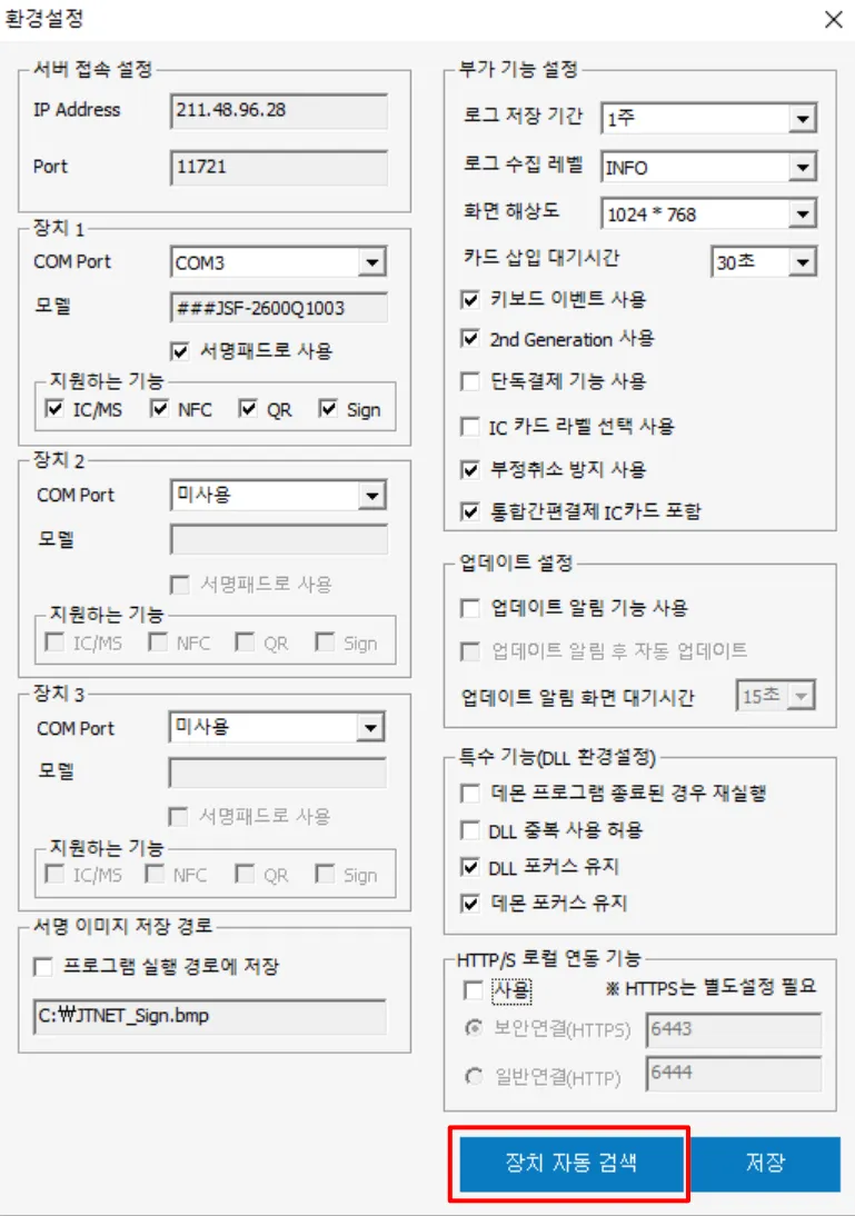 장치 자동 검색: ‘장치 자동 검색’ 버튼 클릭 시, POS/KIOSK에 연결되어 있는 IC 리더기와 서명패드가 검색돼요. ‘확인’ 버튼 클릭 시, 해당 포트로 설정이 완료돼요.