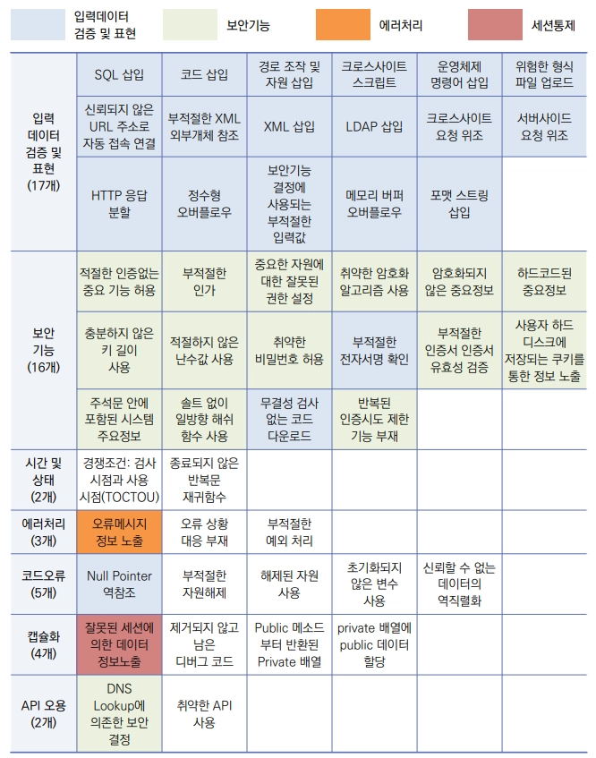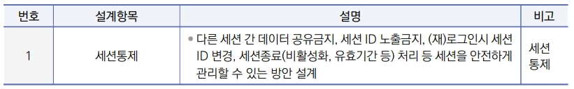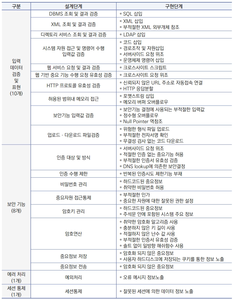 입력데이터 검증 및 표현 | 보안 기능 | 에러 처리 | 세션 통제 |