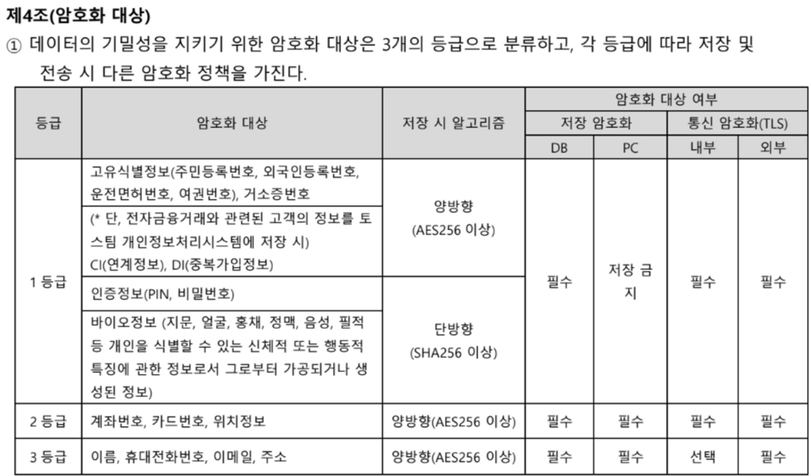 아래는 토스의 정보보호정책서 하위 문서 내용 중 일부입니다. 제4조(암호화 대상) 에서는 각 암호화 대상 별 저장 시 알고리즘 등 통신 암호화 규정을 정의하고 있습니다.