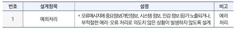 분석 단계에서는 정보처리시스템의 각 기능들을 안전하게 서비스하기 위해 필요한 보안 항목들을 식별하여, 산출물인 요구사항 정의서에 다음과 같은 설계항목을 정의하여, 설계, 구현, 테스트 해야합니다.