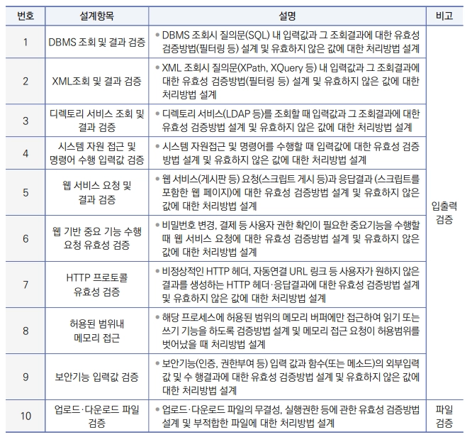 위의 설계단계 기준(20개)을 잘 준수하여 개발하면 아래 구현단계(49개 취약점)들을 대비할 수 있습니다.