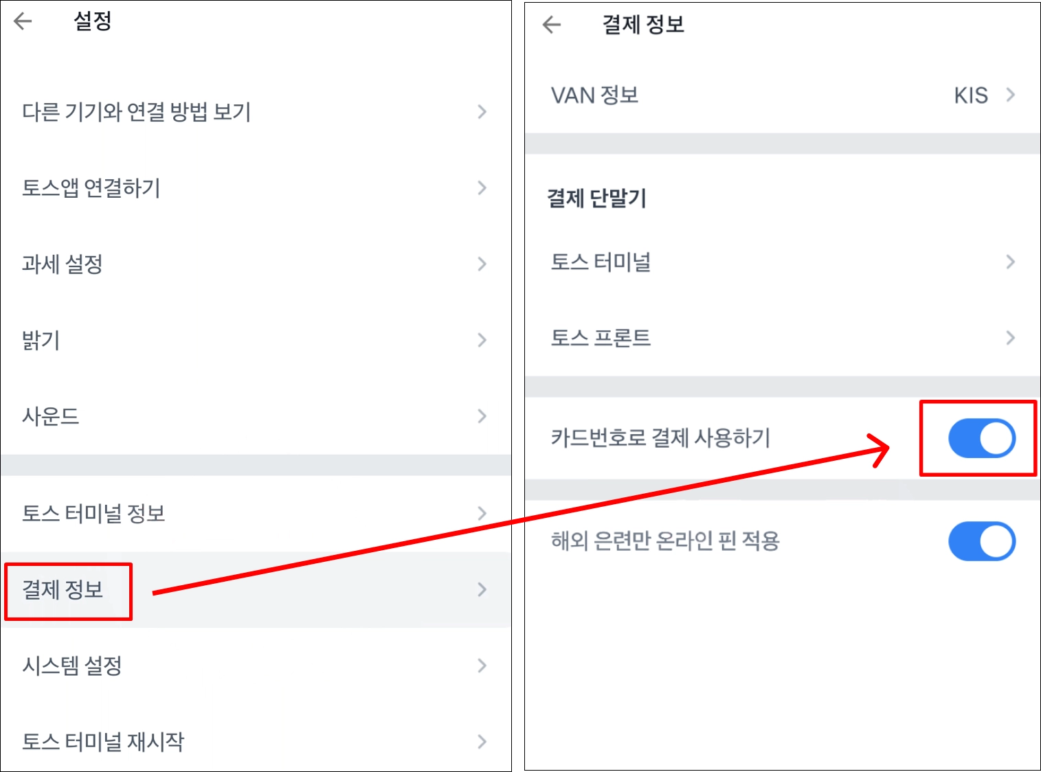 터미널 왼쪽 상단 三 → 설정 → 결제 정보 → 카드번호로 결제 사용하기 활성화