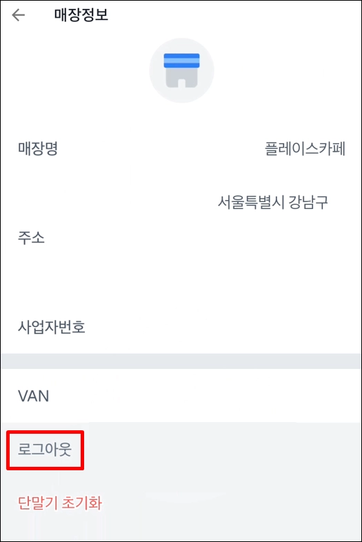 터미널 왼쪽 상단 三 → 설정 → 상호명 → 로그아웃 진행 후 재로그인 부탁 드릴게요.