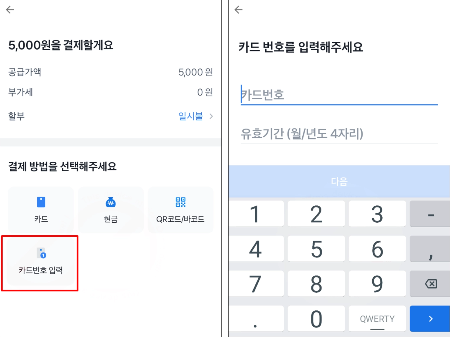 터미널에서 금액 입력 후 결제 수단 선택에서 카드 번호 입력 수단 선택 → 카드 번호와 정보를 입력하고 결제 진행