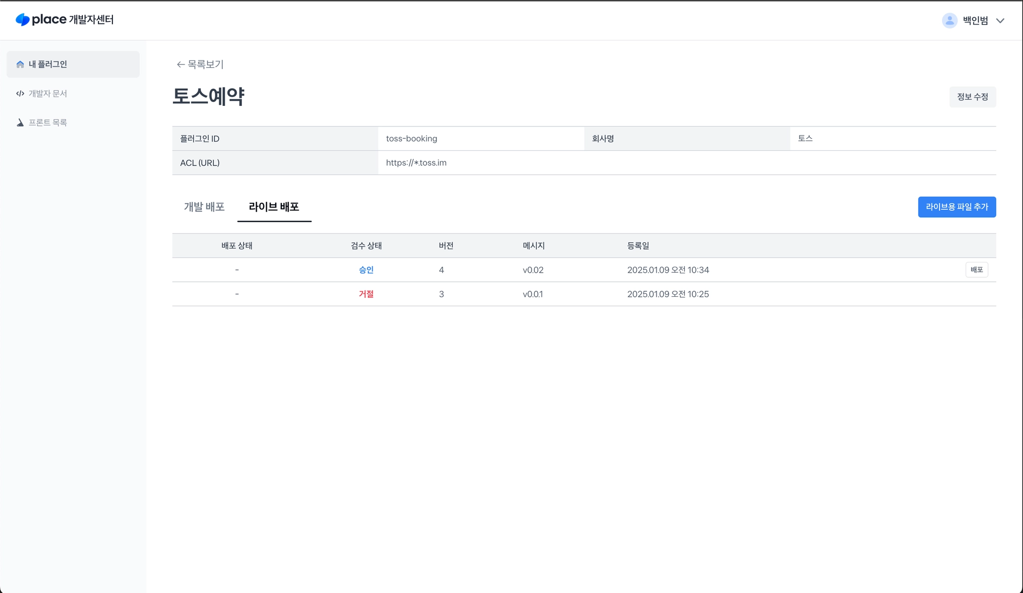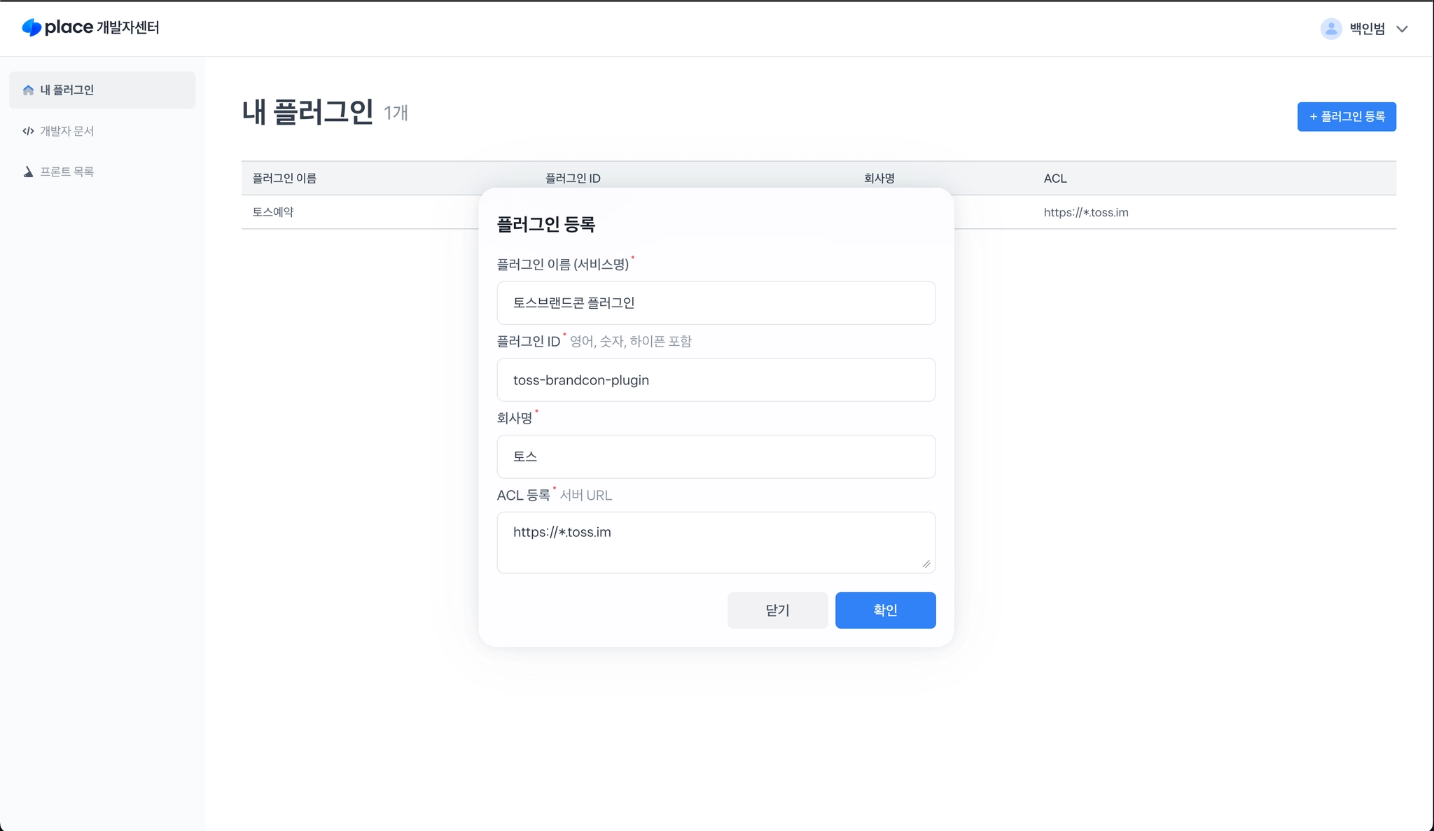 개발자센터에 로그인하면 내 플러그인을 등록/관리 할 수 있습니다.