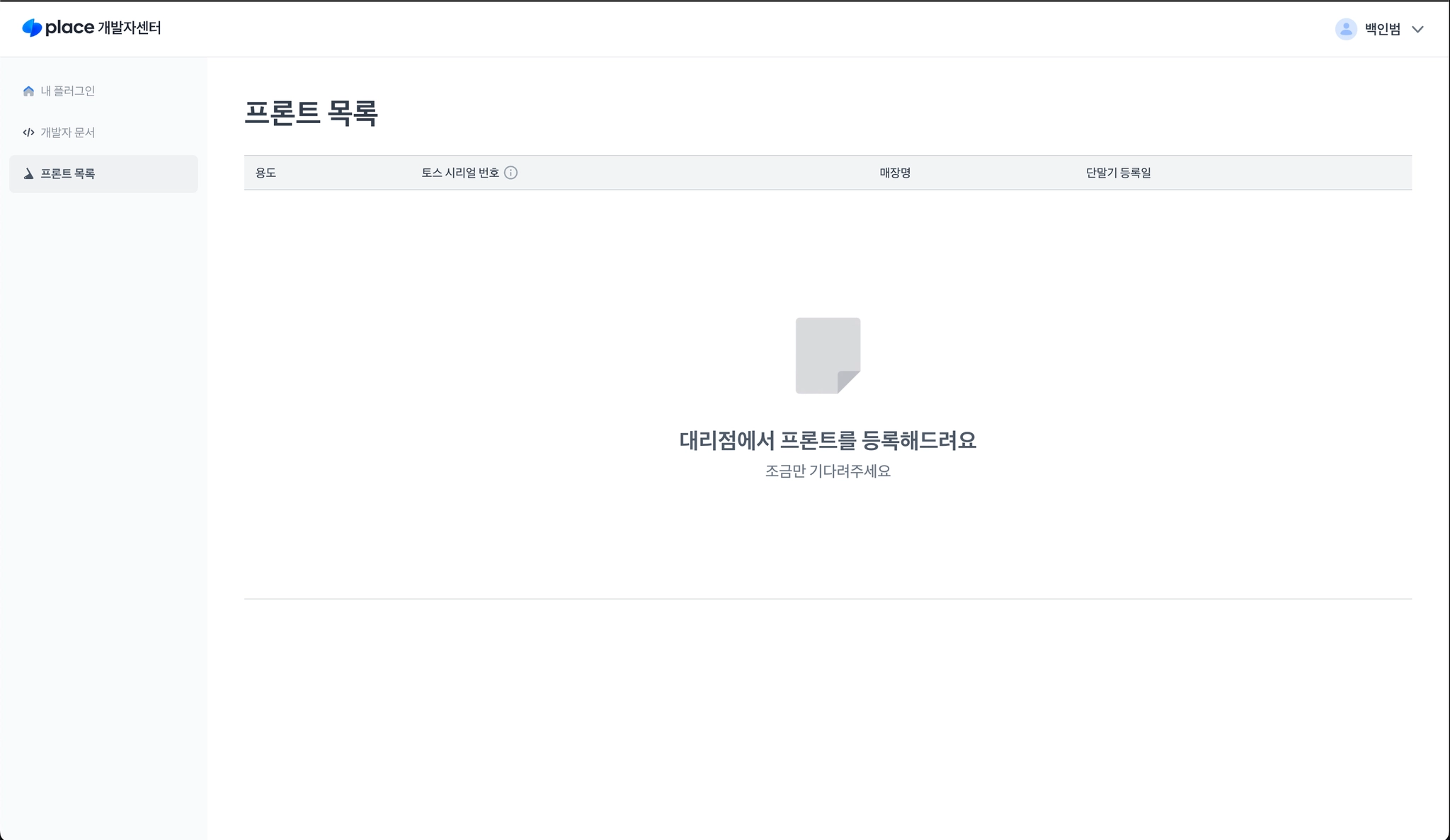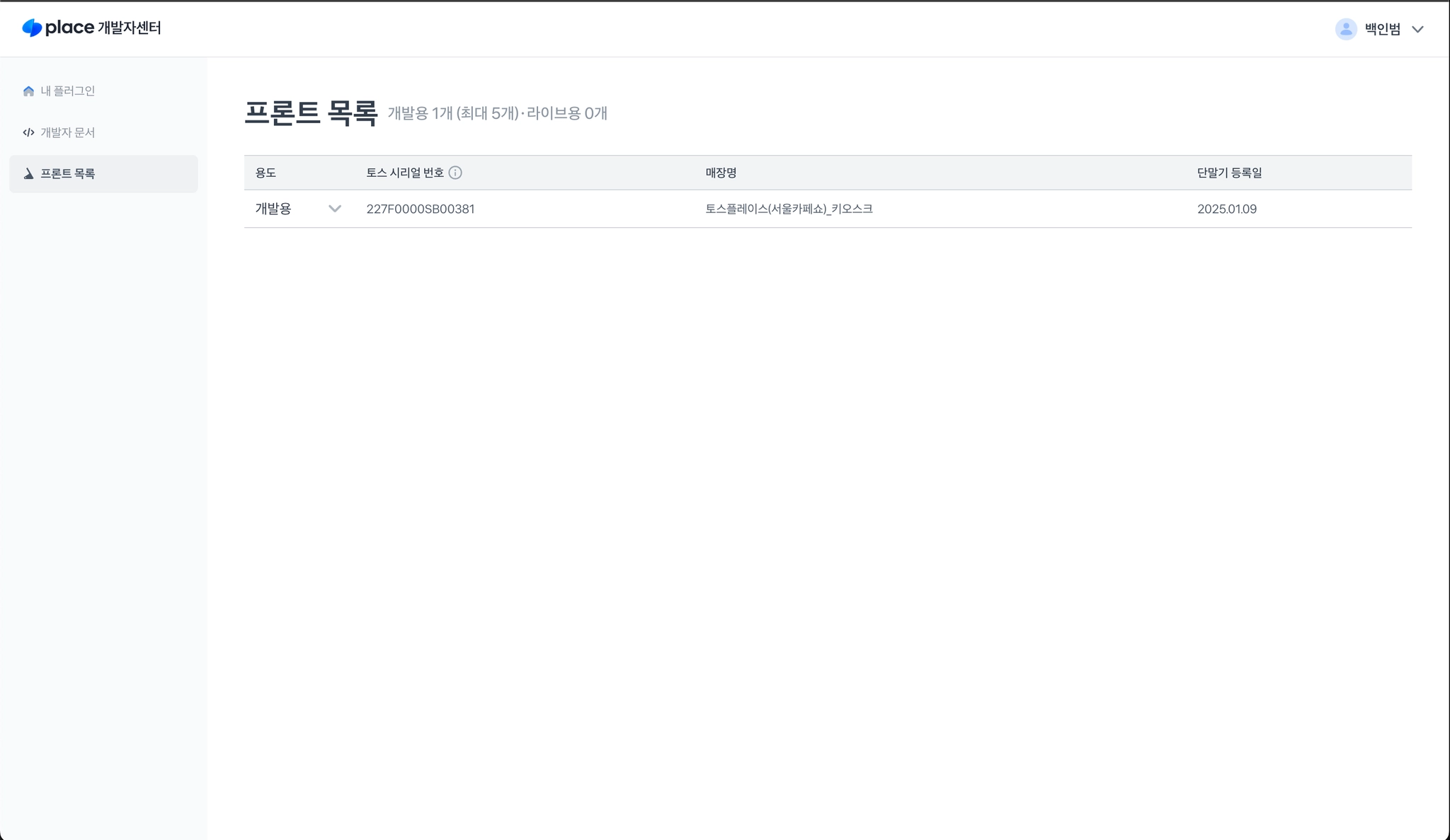 플러그인이 활성화되면 플러그인 개발자센터 프론트목록에 프론트 정보가 노출됩니다.