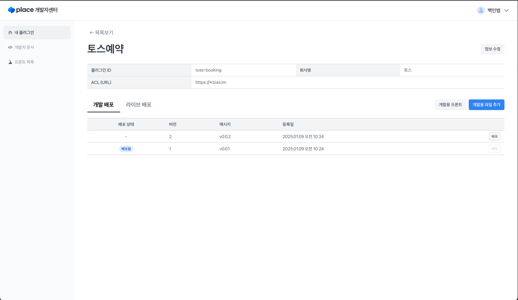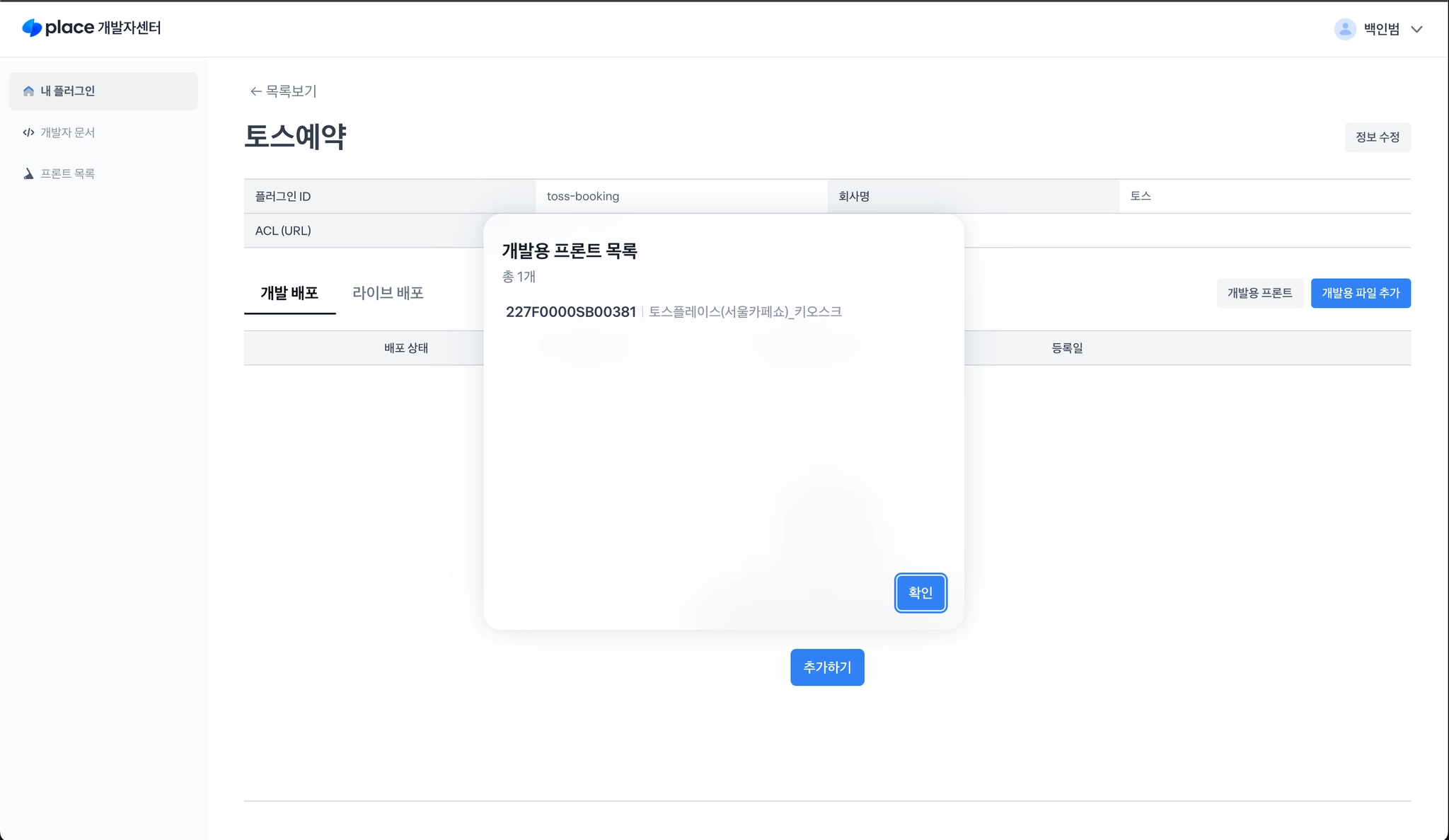 개발용으로 등록된 프론트는 내 플러그인 > 플러그인 상세 화면에서 개발용 프론트 버튼을 눌러 한번에 목록을 확인할 수 있습니다.