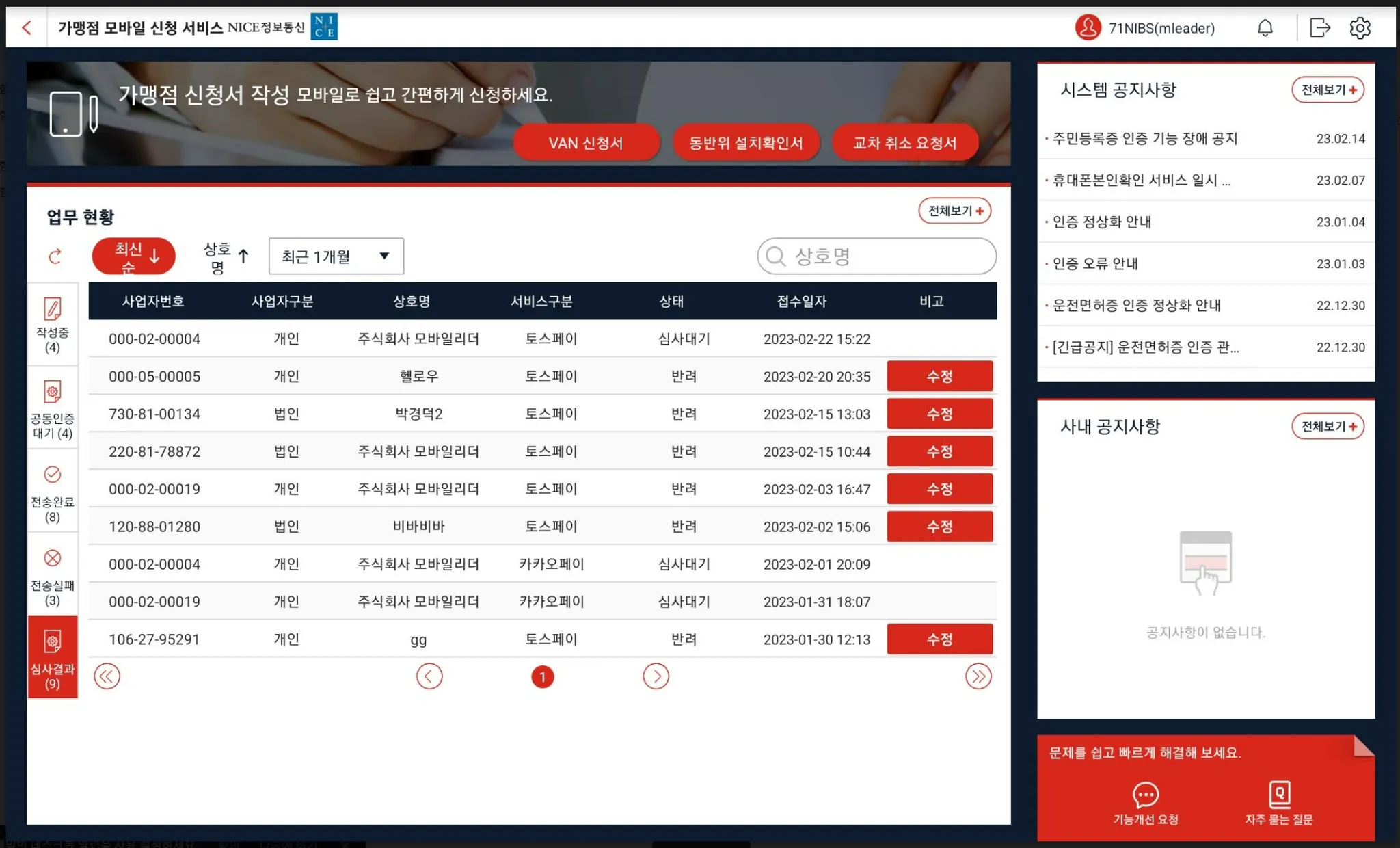 심사 결과 화면에서 신청한 사업자번호, 상호명 확인 가능하며, 결과 또한 동일한 화면 내 상태에서 확인해 주세요.