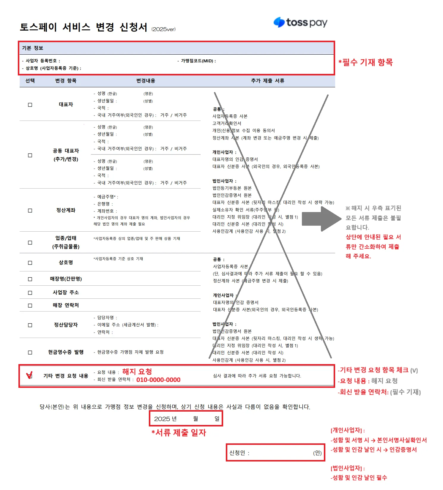변경 신청서 내 가맹점코드(MID)는 공란으로 제출 가능해요.