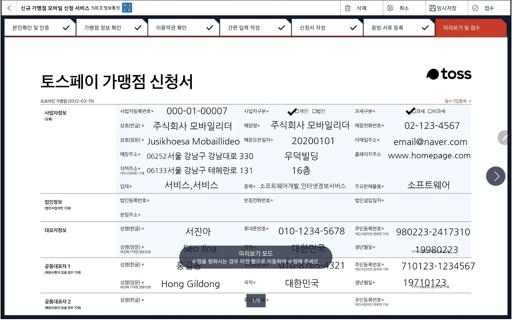 사업자등록증 상 공동대표가 있다면, 공동대표자의 정보 및 동의 여부를 모두 확인하고 있어요.