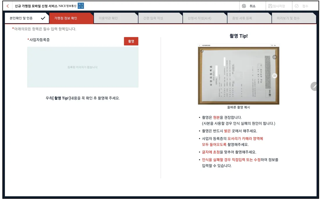 촬영된 사업자등록증 이미지를 기준으로 OCR 인식이 진행되어요. 우측의 촬영 TIP을 확인하시고 기재사항이 잘 보이도록 주의하여 촬영해 주세요.