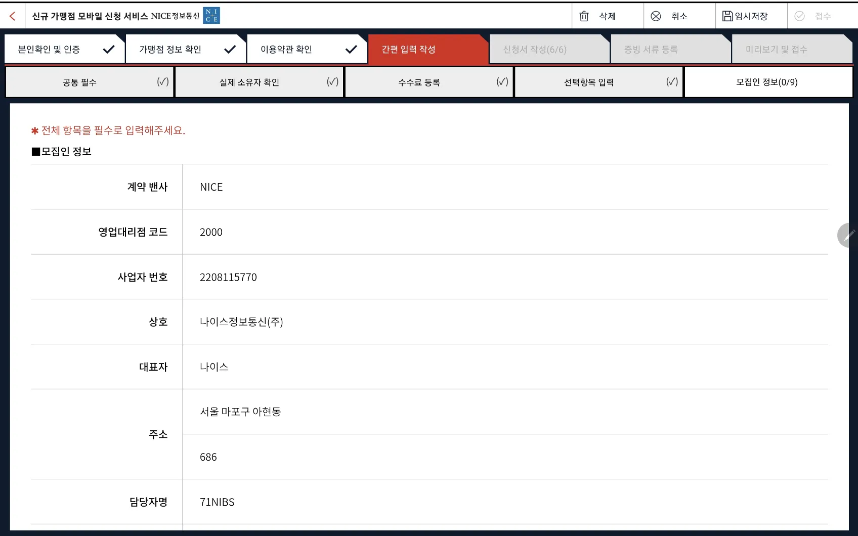 등록번호 오른쪽의 가맹점 확인 버튼을 눌러서 “대형가맹점 여부 확인이 완료되었습니다.”라는 메시지가 나오는지 확인 후 다음단계로 진행해 주세요.
