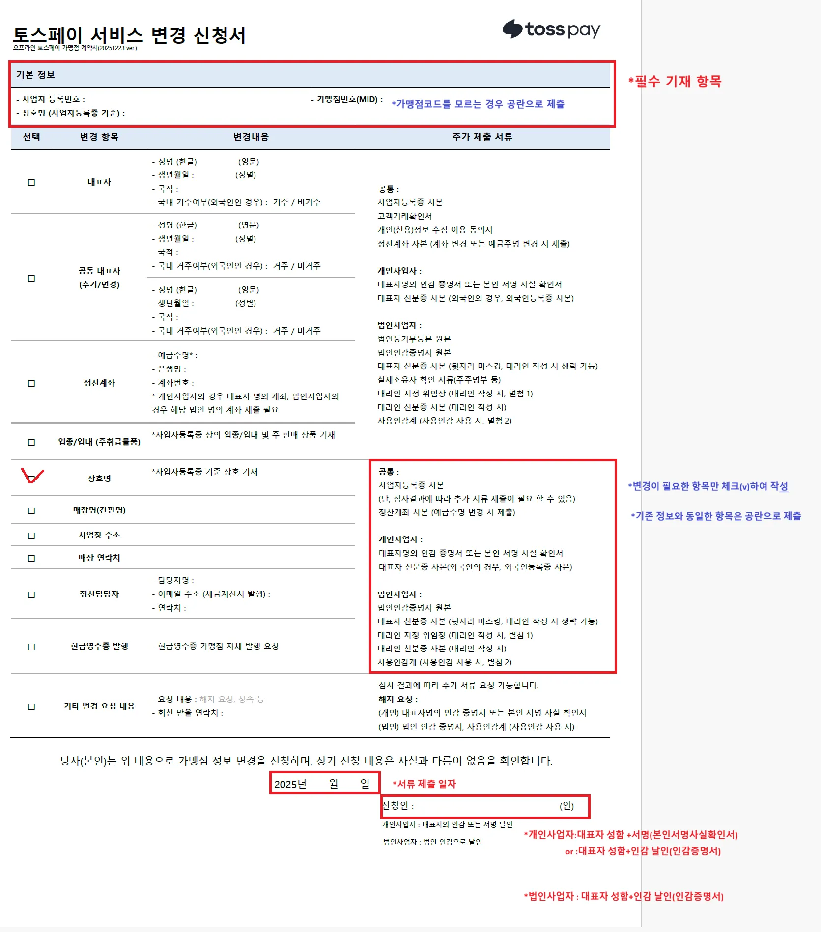 변경 신청서 내 가맹점코드(MID)는 공란으로 제출 가능해요.