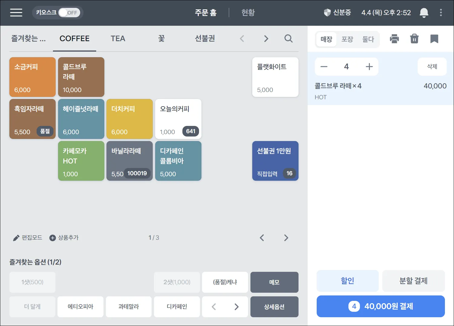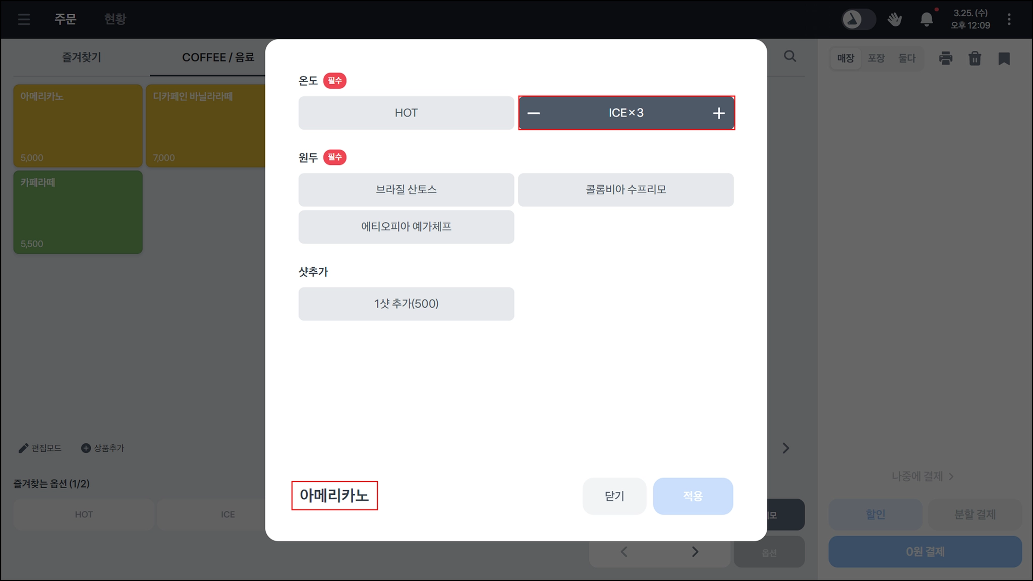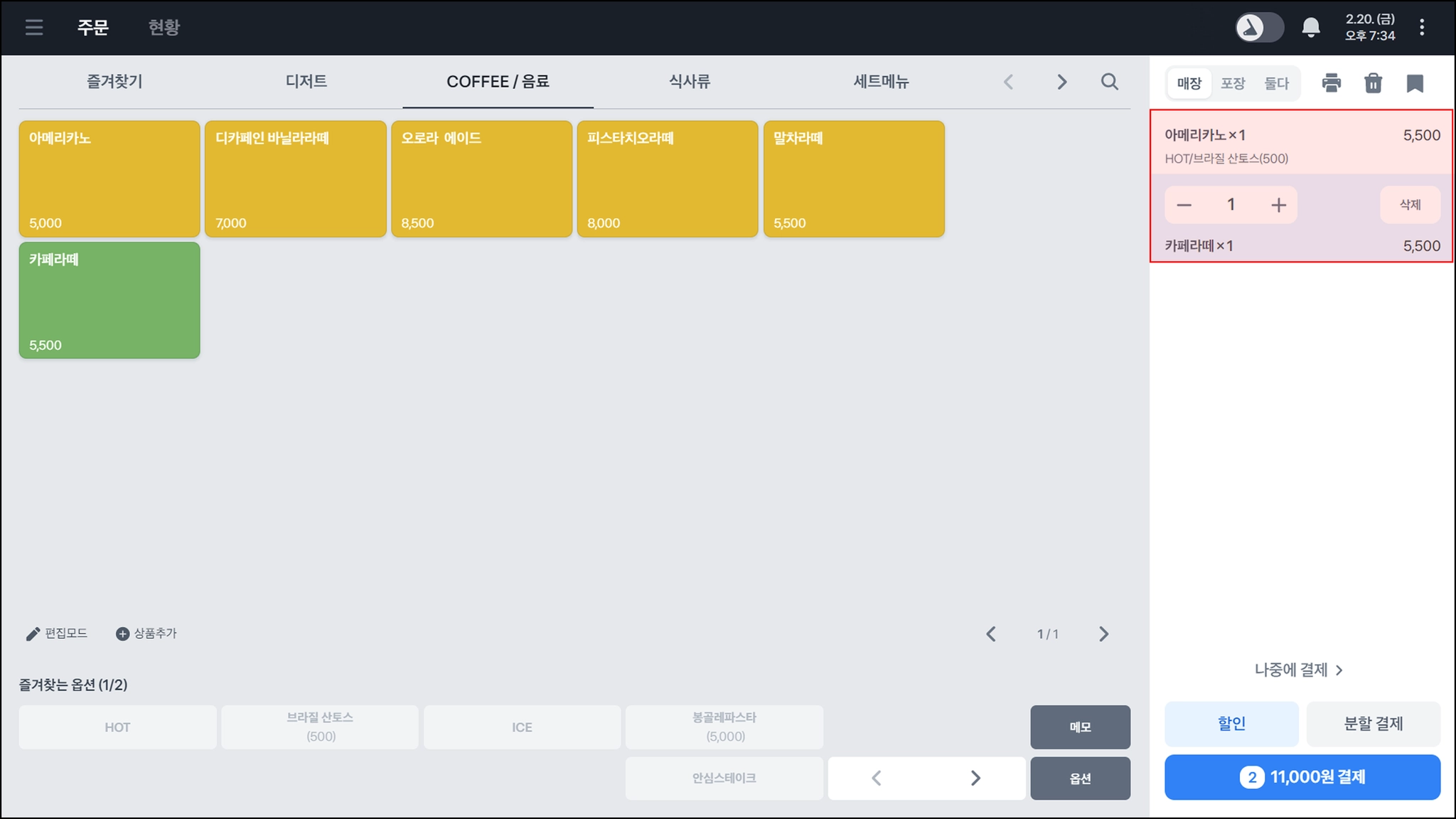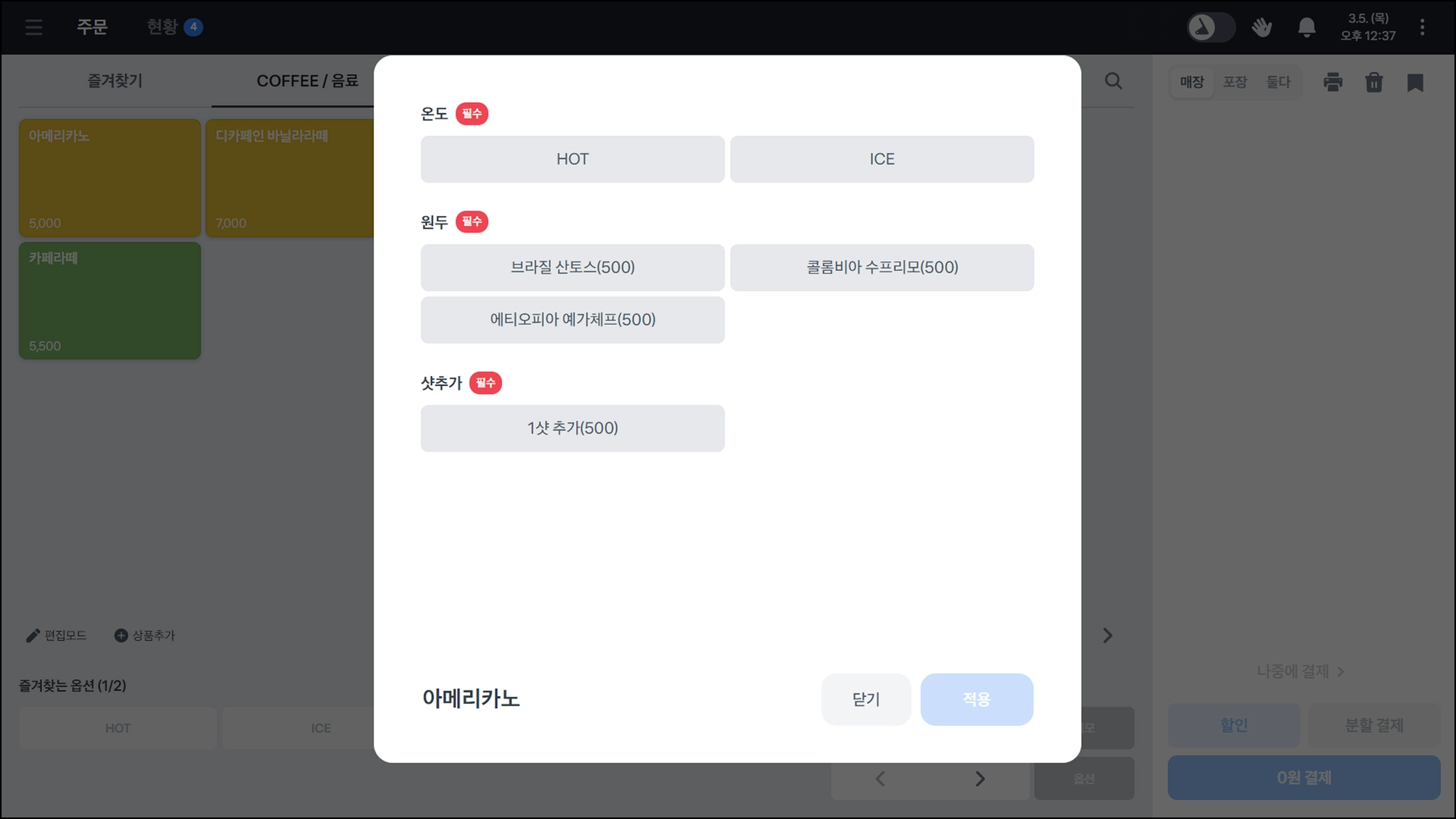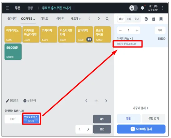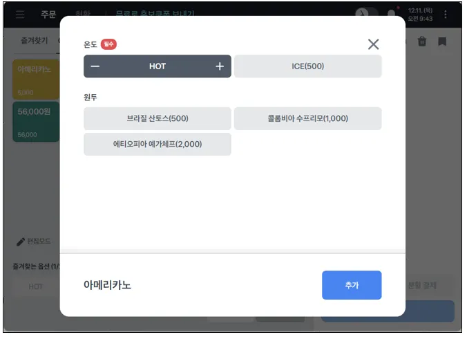 주문한 메뉴에 옵션을 추가하고 싶다면, 옵션 버튼을 클릭하여 생성해둔 옵션을 적용할 수 있어요.