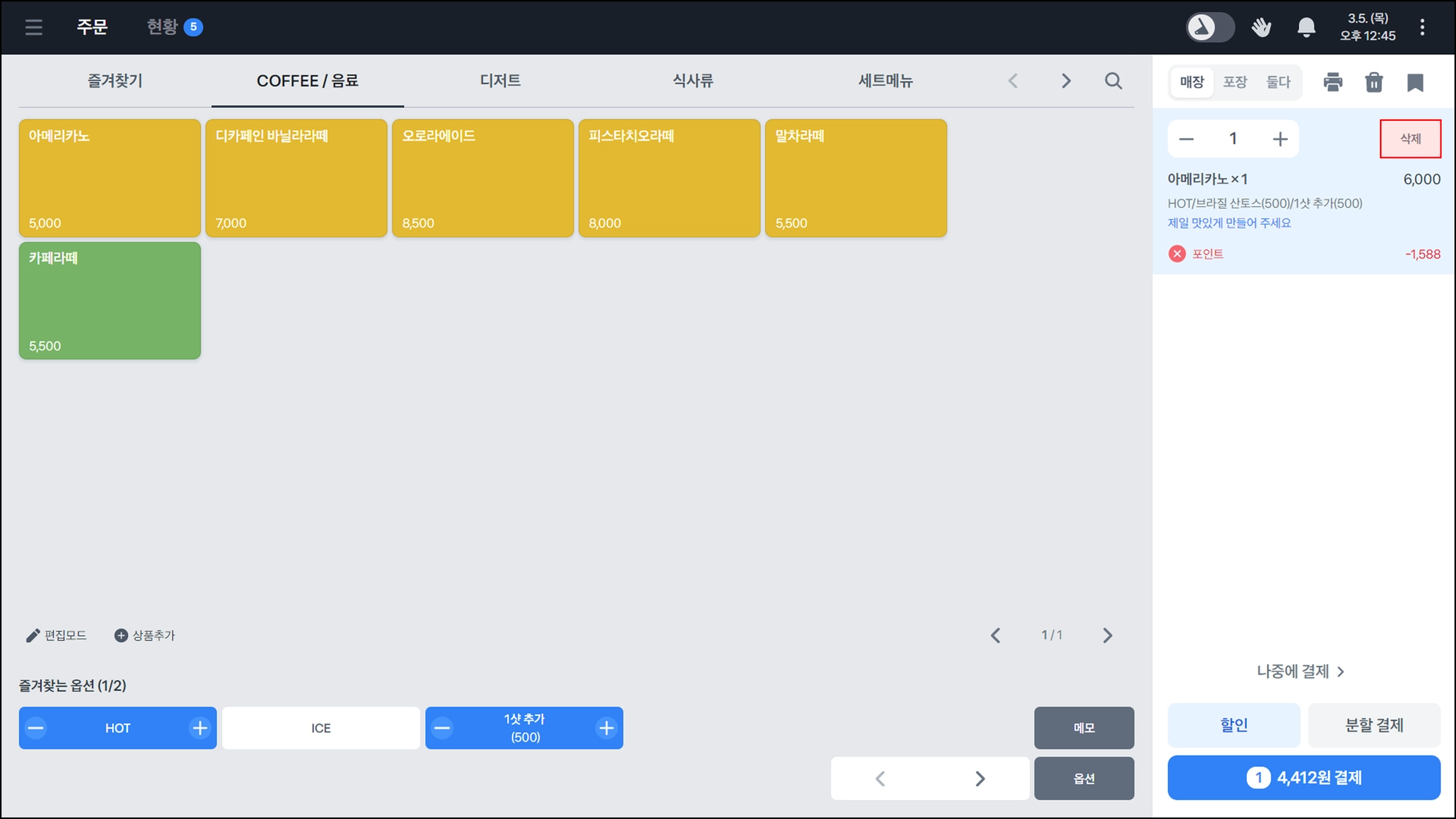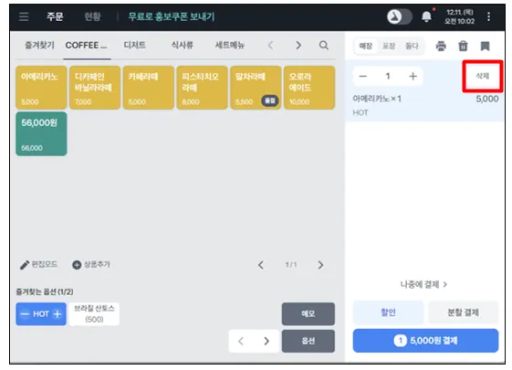삭제 버튼을 클릭하면, 주문내역에 있는 메뉴를 삭제할 수 있어요.