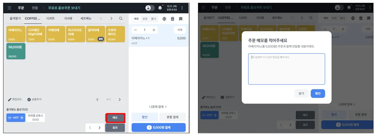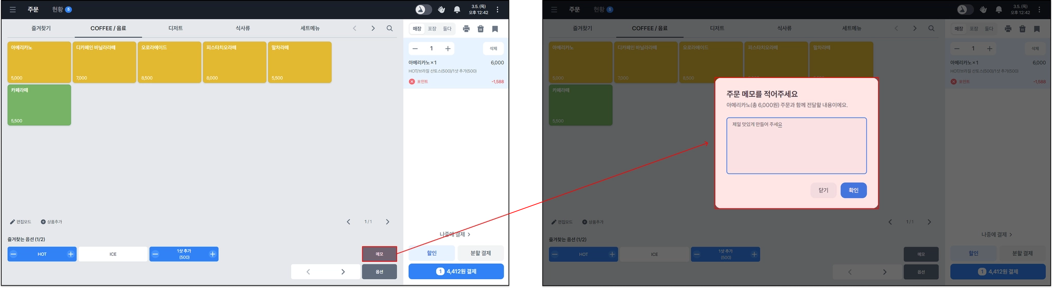 주문한 메뉴에 특이사항을 기재하고 싶다면, 메모 버튼을 클릭하여 메모를 입력할 수 있어요.